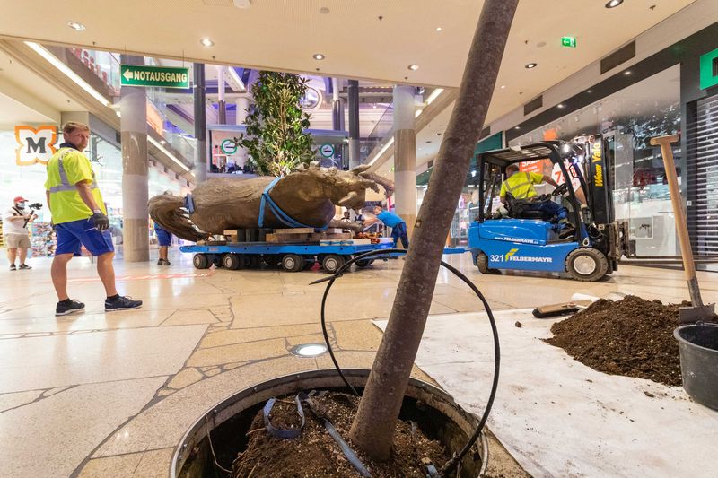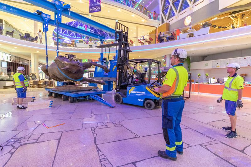 Lagerplatz des schwergewichtigen Bronzepferds war in der Felbermayr-Firmenzentrale in Wels. Für den Auftrag transportierten es die Schwerlastspezialisten mit einem Innenlader-Transportfahrzeug zum Felbermayr-Standort in Linz. Der Schwertransport verlief wie geplant. Das Pferd wurde in Linz zu Testzwecken aufgestellt. Herbert Gruber, Abteilungsleiter der Einbringung in der Felbermayr-Niederlassung Linz, erklärt: „Wir mussten die Probe durchführen, weil die Durchfahrtswege im Einkaufszentrum sehr eng und niedrig sind. Beim Probeversuch wurde wegen der Hubhöhe spekuliert und ein genauer Projektplan erstellt, wie der Schwertransport am besten klappen wird.“ Im Einsatz dafür waren für den Transport ein Spezialanhänger mit Drehteller und für das Einheben ein Hubgerüst sowie ein Raupenkran LR 1060.