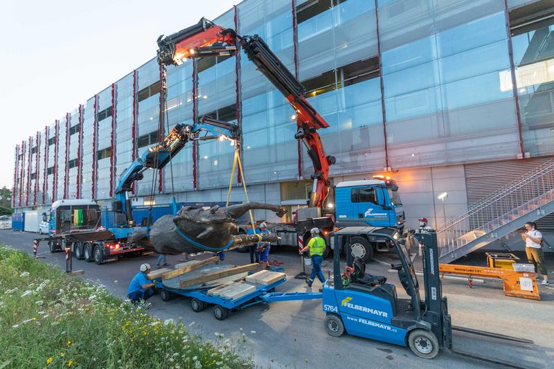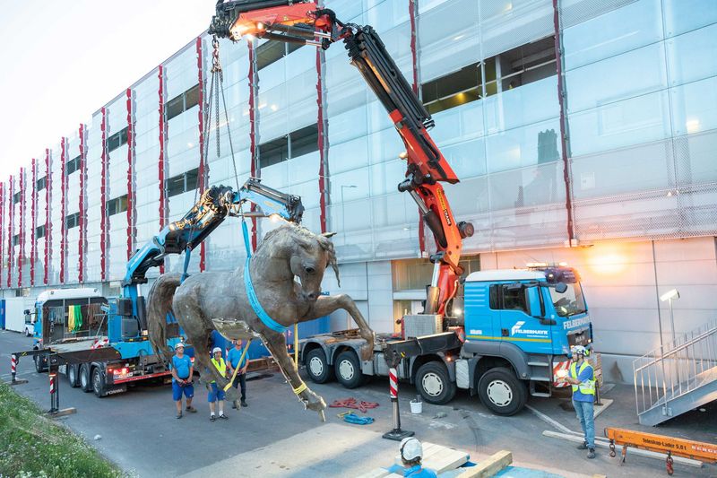 Mitte August wurde es dann ernst. Das Pferd wurde mit einem Innenlader-Transportfahrzeug zum Einsatzort geliefert. Für den anschließenden Umschlag waren zwei Ladekrane und drei Elektrostapler mit fünf Tonnen Traglast im Einsatz. Der sechs Tonnen schwere Bronzekorpus wurde auf einen Spezialanhänger mit Drehvorrichtung umgeschlagen. Der Drehteller soll das Manövrieren bis zum Aufstellort ermöglichen. „Der Weg bis zum Palmenplatz war eine große Herausforderung“, kommentiert Gruber, „da die so schon engen Zufahrtswege auch noch von Magnolienbäumen weiter verengt wurden.“ Eine Gärtnerei wurde beauftragt, um die Pflanzen behutsam etwas zu kippen, sodass für den Stapler mit dem Schwergewicht im Anhang der Weg frei wurde. Während des Antransports des Schwerguts wurde am Palmenplatz bereits das Hubgerüst aufgebaut, welches das sechs Tonnen schwere Pferd wieder aufrichtete. Anschließend wurde der Koloss in die Höhe gezogen, sodass er auf die neun Meter hohe und vier Tonnen schwere Unterkonstruktion montiert werden konnte.