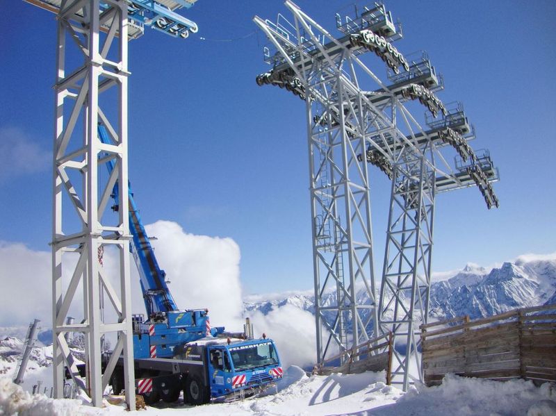 Ein 120 Tonner montierte währenddessen die Einlaufstütze zur Bergstation. Mit 220 Tonnen verarbeitetem Stahl ist sie die schwerste Stütze Europas. Für die davor gelegene Stütze "Zwei" reichte die Länge des Hauptauslegers nicht aus. „Deshalb kam ergänzend zum 60 Meter langen Teleausleger noch ein zusätzlicher Spitzausleger mit neun Metern zum Einsatz", erklärt Lettenbichler.