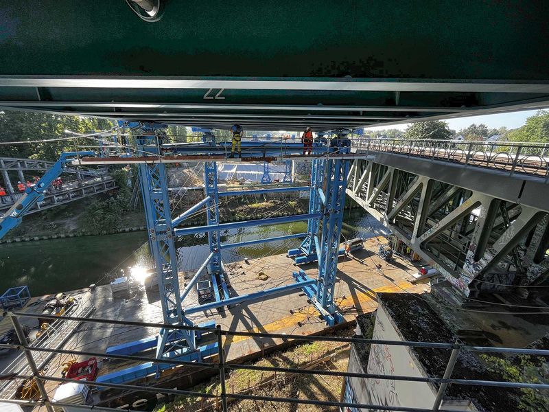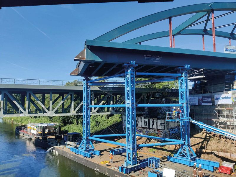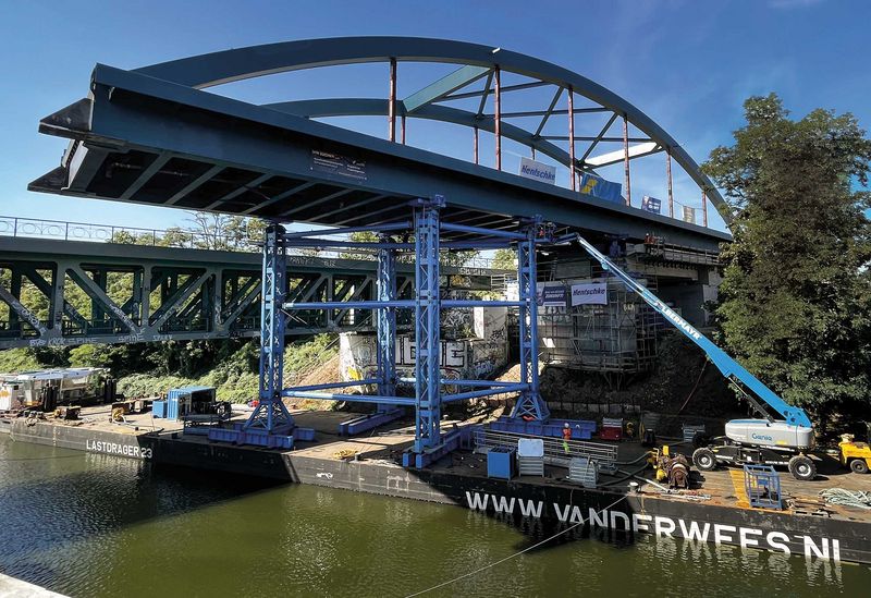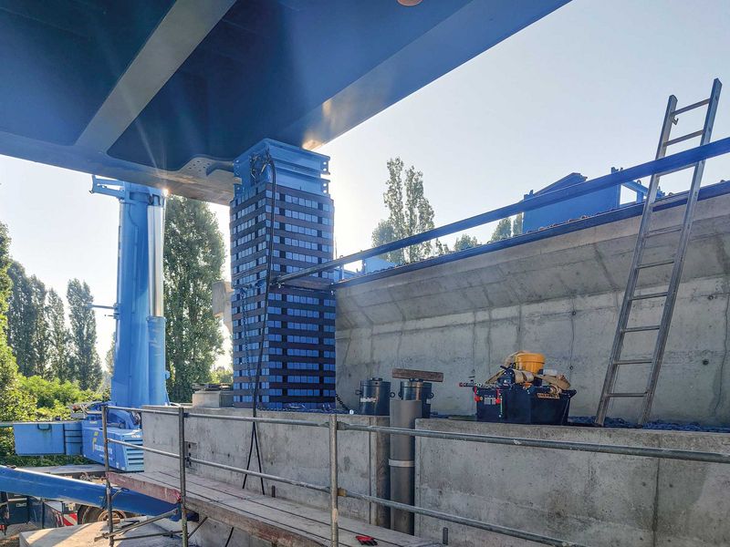 Am Ende sei die 67 Meter lange, 12,5 Meter hohe und 12 Meter breite Stabbogenbrücke nur mehr auf vier Kletterpressen gestanden. „Mit den hydraulischen Zylindern konnten wir die Brücke so hochstapeln, um all unsere Geräte wieder abzubauen und die Brücke abschließend wieder zwei Meter abzustapeln und auf ihren Widerlagern abzusetzen“, schildert Aarts den reibungslos verlaufenen Abschluss des neuntägigen Unterfangens.