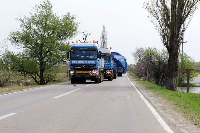 Ab der siebzig Kilometer südlich von Bukarest gelegenen Stadt Oltenita wurde die Gasturbine mittels einer sogenannten Schnabelbrücke transportiert. "Das war nötig um die Transporthöhe so gering wie möglich halten zu können", erklärt Costea den Sinn der Transportvorrichtung die vorne und hinten, im Sinne einer optimalen Achsverteilung, auf je 22 Achsen gelagert war.