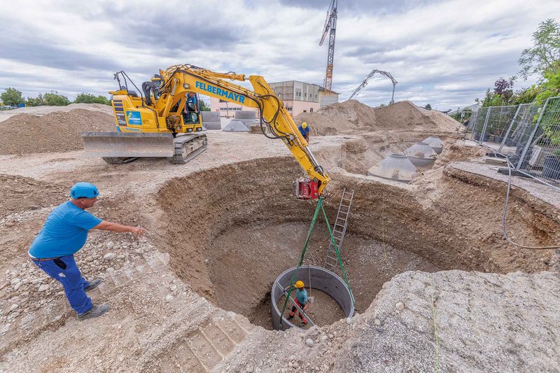 Anschließend übernahm der Hoch- und Industriebau die Errichtung eines unterirdischen Regenwasserbeckens mit einem Fassungsvermögen von rund 640 Kubikmetern sowie die Erweiterung der Geschäftsfläche um 300 Quadratmeter. Zusätzlich wurde ein Liftschacht im bestehenden Gebäude errichtet, der den barrierefreien Zugang zum Bürotrakt über der Geschäftsfläche ermöglicht. Wie intensiv diese Arbeiten waren, verdeutlicht Slavisa Kesic, Bauleiter Hoch-, Industrie- und Kraftwerksbau: „Der Liftschacht war echte Handarbeit: Unter den beengten Verhältnissen und bei laufendem Geschäftsbetrieb war an den Einsatz eines Krans nicht zu denken. Also haben wir jeden Ziegel einzeln in die Hand genommen und den Schacht Stein für Stein hochgemauert.“