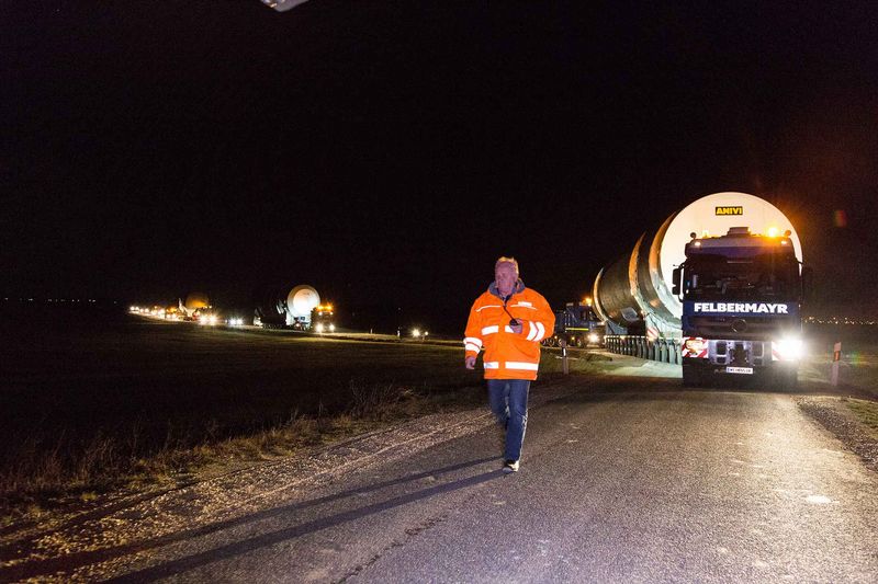 „Da wir eine Transporthöhe von 8,5 Metern erreichten, waren schon in der ersten Nacht zahlreiche Stromleitungen zu kappen“, schildert Kaspar die zeitraubenden Aktivitäten. So seien für die etwa 50 Kilometer lange Strecke von Gönyű bis Bakonysarkany acht Stunden Fahrzeit benötigt worden. Eine große Verzögerung brachte auch die Bahnkreuzung bei Nagyszentjanos. Diese konnte erst um 1.30 Uhr passiert werden, da der Bahnverkehr umgeleitet und alle Schranken und Elektroleitungen entfernt werden mussten. „Dank der akribischen Planung von BauTrans Ungarn lief aber alles optimal“, hebt Kaspar die Arbeit seiner ungarischen Kollegen bewundernd hervor und merkt an, dass das von Wels aus wohl kaum zu realisieren gewesen sei. In der zweiten Nacht stellten sich dem insgesamt 100-köpfigen Transportteam zahlreiche Gasleitungen, die mit Stahlplatten abgedeckt werden mussten, in den Weg. Aber auch Ampelanlagen, Über-kopfwegweiser und Stromleitungen waren vorübergehend zu demontieren. Vor dem Erreichen des Etappenziels in Csor musste noch eine Bundesstraße aufgrund zu niedriger Brückenbauwerke umfahren werden. Das Resultat waren enge Kurvenradien auf Nebenstraßen, die wegen zu geringer Straßenbreite mit Stahlplatten ausgelegt werden mussten. Auch in der dritten Nacht konnte eine zu tief liegende Brücke nicht unterfahren werden, deshalb wurde die Hauptstraße verlassen und auf eine zuvor errichtete Behelfsstraße ausgewichen. „Auf dieser fünf Kilometer langen Schotterpiste durften wir maximal mit 20 Kilometern pro Stunde fahren und mussten 200 Meter Mindestabstand zwischen den Fahrzeugen halten“, schildert Kaspar die zeitraubenden Umstände. Auf die Frage, ob er denn in Bezug auf die Statik keine Bedenken gehabt hätte, antwortet Kaspar mit einem klaren „Nein“. Denn die Behelfsstraße sei zuvor mittels Festigkeitsbohrungen auf ihre Tauglichkeit untersucht worden. Bevor die dritte Etappe im ungarischen Ösi beendet werden konnte, war noch ein Bahnübergang mit zu tief liegenden Oberleitungen zu passieren. Richtig spannend wurde es aber noch beim Überqueren einer Brücke. „Die Auffahrtsrampe war zu steil, somit wären wir ohne bauliche Maßnahmen auf der Fahrbahn aufgesessen“, erklärt Kaspar. Die Lösung wurde in der Abflachung der Fahrbahn mittels Schotter und einer speziellen Zementmischung gefunden. Darüber wurden dann zur besseren Gewichtsverteilung noch Stahlplatten gelegt. „Das hat dann bestens geklappt“, freut sich Kaspar über die im Voraus geplanten Maßnahmen. Die vierte und letzte Etappe war glücklicherweise, abgesehen von einigen Baumschnitten wegen zu geringer Lichtraumprofile, von keinen besonderen Maßnahmen mehr begleitet. Somit konnte das Werk nach vier Nachtfahrten und rund 140 zurückgelegten Kilometern wie vorgesehen erreicht werden. In weiterer Folge werden die Komponenten noch auf die Fundamente gestellt und in die Produktion integriert. Nach der geplanten Inbetriebnahme im Jahr 2016 sollen die Komponenten dann die Tagesproduktionsmenge der rund 40 Jahre alten Ammoniak-Anlage von 1.000 Tonnen auf 1.650 Tonnen steigern können. Zu guter Letzt soll durch die Modernisierung der Anlage aber auch der Stromverbrauch reduziert werden können.