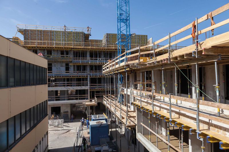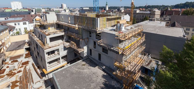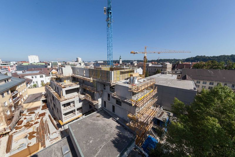 Mit den eigentlichen Hochbauarbeiten wurde heuer im Frühjahr begonnen, also etwa ein Jahr nach dem Beginn der Arbeiten zur Baufeldfreimachung. „Erschwerend dabei ist, dass dabei einige tragende Wände nicht übereinander platziert sind. Weiters sind die Bauarbeiten auch durch auskragende Geschoße gefordert“, nennt Grundner komplexe Aufgabenstellungen aufgrund anspruchsvoller Architektur. Aber auch beengte Platzverhältnisse, eingeschränkte Zufahrtswege und ein für Innenstädte typisches Verkehrsaufkommen sind ständige Begleiter. Das erfordert eine detailreiche Planung der Baustellenlogistik und flexibles Handeln vor Ort. Die Arbeiten für den zu 95 Prozent mit Ortbeton errichteten Rohbau wurden im November abgeschlossen. Die Schlüsselübergabe für die in Niedrigenergie-Bauweise ausgeführten Wohnungen und Büroflächen ist für Ende 2018/Anfang 2019 geplant.