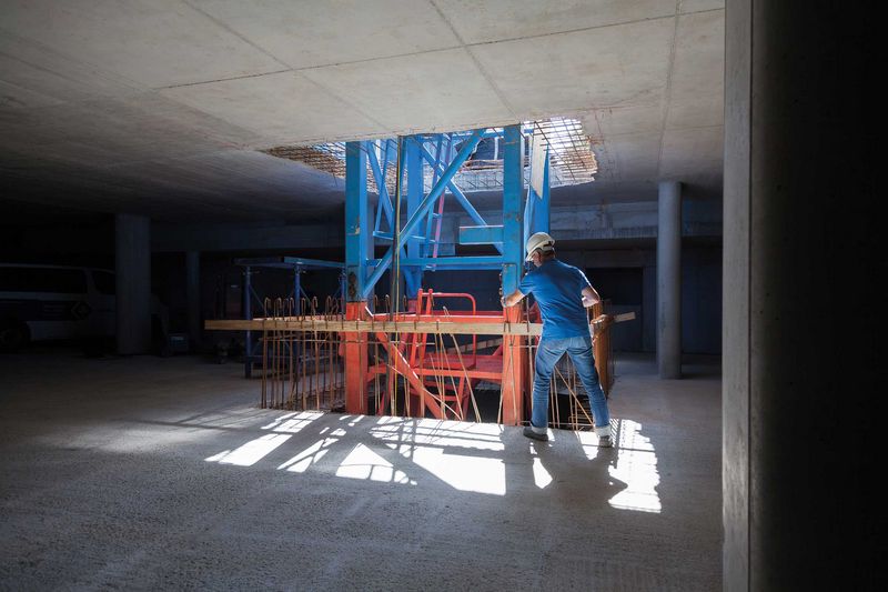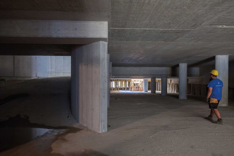 Zur Errichtung der Tiefgarage mit den zwei Etagen war eine sieben Meter tiefe Baugrube nötig. „Um das realisieren zu können, mussten wir während der Erdarbeiten aus statischen Gründen die Baugrubenumschließung mit Stahlträgern aussteifen“, nennt Felbermayr-Bauleiter Robert Grundner die Vorsichtsmaßnahme und erklärt, dass das aufgrund der angrenzenden Nachbargebäude notwendig gewesen sei. Nach dem Betonieren der 1. Tiefgaragendecke konnte die Aussteifung entfernt werden. Eine Besonderheit ist auch, dass der benötigte Turmdrehkran in der Baugrube aufgestellt und die Betondecke für das Durchführen des Gittermasts für die Zeit der Bauarbeiten ausgespart wurde.