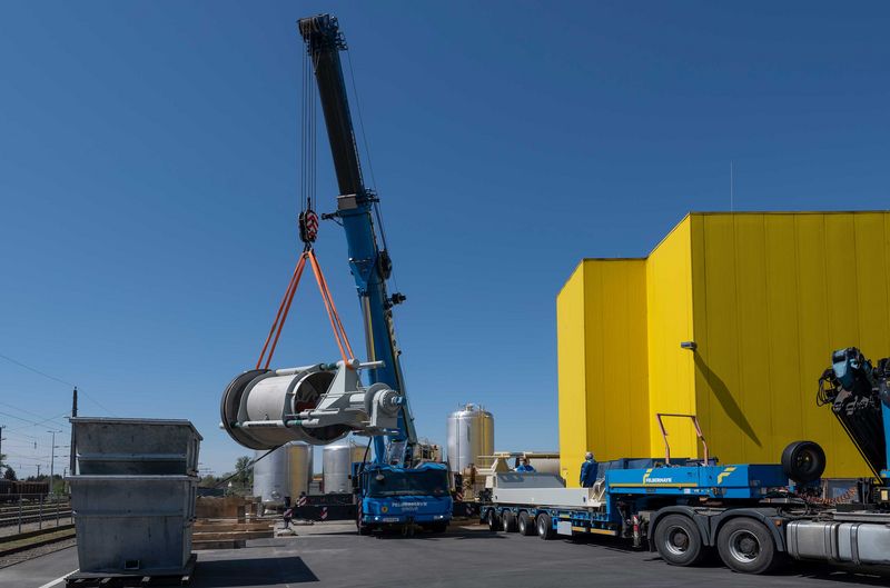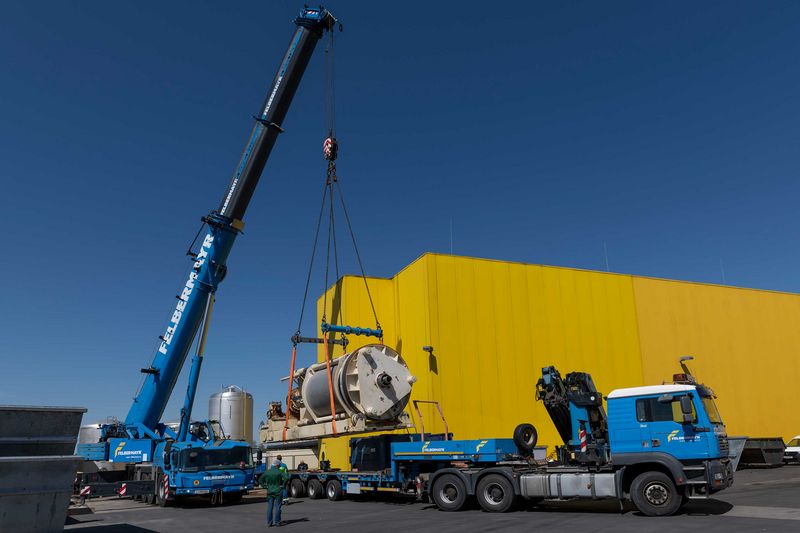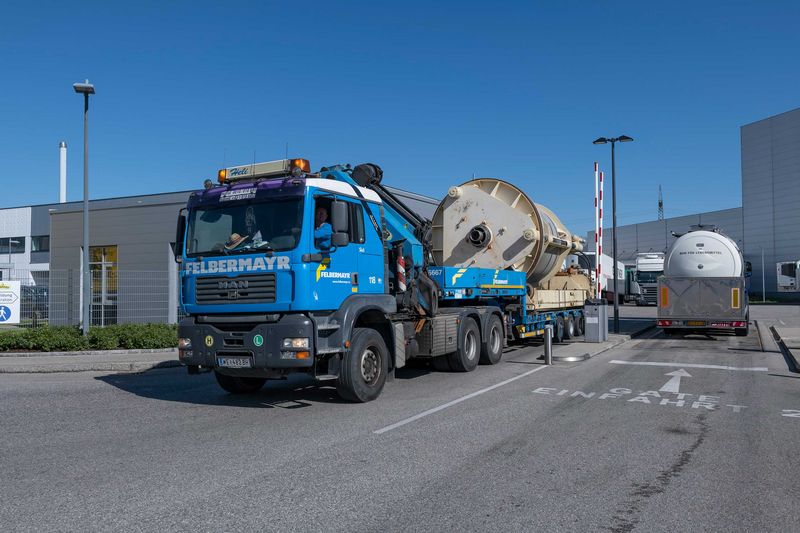 Für die Manipulation der schweren Teile am Produktionsstandort kamen ein Mobilkran mit 250 Tonnen Traglast, Gabel- und Teleskopstapler sowie ein Schwertransportfahrzeug zum Einsatz. Die neue Presse wurde, in umgekehrter Reihenfolge zur Ausbringung, eingebracht. Jedoch wiegt die neue Presse etwa 43 Tonnen und ist rund zweieinhalb Meter länger als die alte. Das machte die Einbringung schwierig: „Letztendlich hatten wir noch etwa zwei Zentimeter Luft“, berichtet Gruber und freut sich über die erfolgreiche Einbringung, auf die mit köstlichem Fruchtsaft angestoßen wurde.