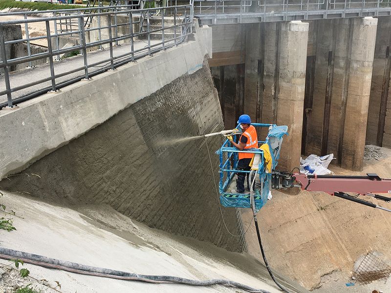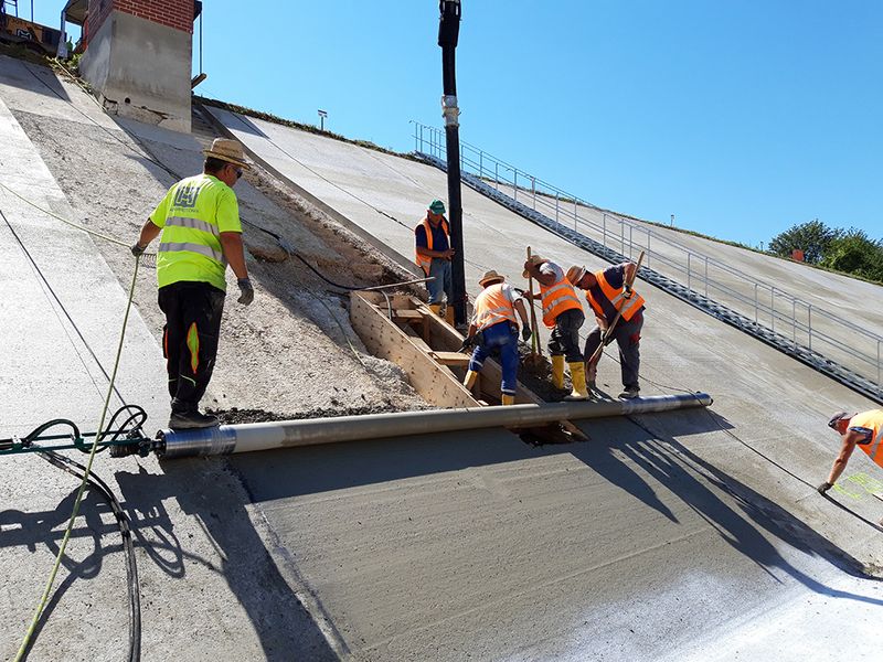 Eine dahingehend besondere Problemstellung war die maximale Belastbarkeit des bestehenden Dammkörpers mit nur zwölf Tonnen sowie die Entwicklung eines speziellen Betons für die Oberflächendichtung. „Für eine optimale Einbaubarkeit und Oberflächenbeschaffenheit musste der Beton entsprechend weich, aber dennoch ausreichend widerstandsfähig für die mechanische Beanspruchung sein,“ beschreibt Pieringer die Problemstellung. In Zusammenarbeit mit den Planern und der Technischen Universität München wurde ein Betonrezept erarbeitet, das diese Eigenschaften erfüllen sollte. Mittels dreier Probefelder auf den steilen Böschungen wurden die Eigenschaften des Betons auf seine Praxistauglichkeit geprüft und positiv beurteilt. Somit konnte mit den flächendeckenden Sanierungsmaßnahmen begonnen werden.