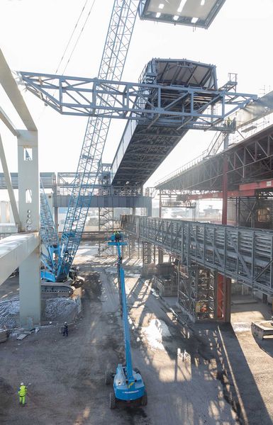 Zum großen Finale für die Förderbandbrücke stellte das Felbermayr-Team Anfang des Jahres die beiden Kranschwergewichte LR 1300 und den 1000-Tonner LR 11000 in den Dienst. Um die bis zu 180 Tonnen schweren und 54 Meter langen Teile für den Anschluss an das Bestandsstahlwerk in 48 Metern Höhe zu positionieren, wurden die ersten beiden Elemente mit den beiden Kranen in Position gebracht und montiert. Den finalen Hub erledigte der LR 11000 im Alleingang mit einem 96 Meter langen Gittermastausleger und gesamt 570 Tonnen Ballast. Dabei wurde das letzte Teilstück mit einem Gewicht von 42 Tonnen auf eine Höhe von 48 Meter, bei einer Ausladung von 65 Metern, millimetergenau eingepasst.