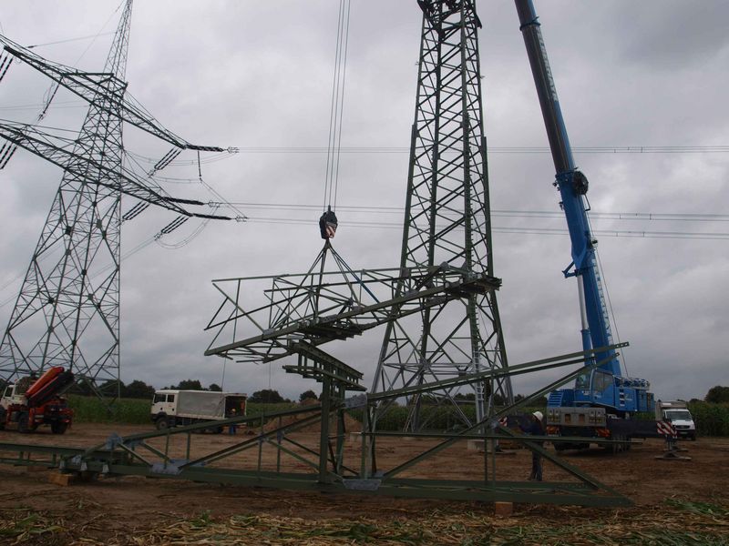 „Gebaut wird bei laufendem Netzbetrieb“, sagt Wolski weiter. Dazu wird zunächst eine Seite (ein System) der bestehenden Trasse abgeschaltet und demontiert. An dieser frei geschalteten Seite werden die neuen Masten errichtet und komplett bestückt. Geht das neue System in Betrieb, kann das zweite System der bestehenden Leitung abgeschaltet und demontiert werden. So entsteht die nötige Baufreiheit, um das zweite System zu installieren.