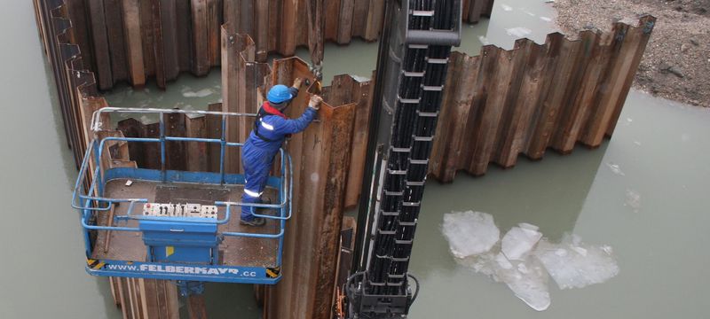 Der Mobilkran, mit einer maximalen Traglast von 160 Tonnen hob, die bis zu 16 Meter langen Spundwände, vom Ufer über das Wasser, setzte sie dort in etwa 25 Meter Entfernung vertikal ab. Danach wurden sie von der Ramme übernommen. "Das Umhängen vom Kran auf die Ramme wurde von einem Mitarbeiter mittels einer Arbeitsbühne bewerkstelligt", erklärt Dunzendorfer die bis zu 15 Meter über dem Wasserspiegel durchgeführte Arbeit. Anschließend wurden die Stück für Stück von einem Vermesser eingerichteten Spundbohlen etwa acht Meter tief in das Flussbett gerammt. Auf diese Art wurden insgesamt 150 Einzelbohlen gerammt. Letztendlich ergab das einen Spundwandkasten mit rund 1.500 Quadratmetern der auch mit sehr schwierigen Eck- und Knotenpunktdetailausführungen errichtet wurde. Innerhalb dieses Kastens wird derzeit auf trockenem Boden die sogenannte Trempelschiene für das Hafentor errichtet. In Bauphase 1 reicht die allerdings nur bis zur Mitte des Schifffahrtkanals. Der Grund: Um den Schifffverkehr aufrecht erhalten zu können, wird derzeit nur bis zur Mitte des Kanals gebaut. Nachdem dieser Teil fertig ist, wird der Spundwandkasten abgebaut und auf der anderen Hälfte wieder in den Schiffsanfahrtsschutz integriert.