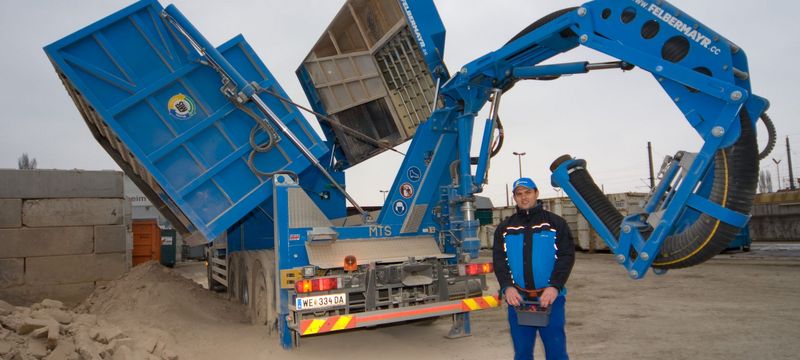 "Ein Einsatz, wie geschaffen für den Saugbagger", kommentiert Manuel Zitzler vom Felbermayr Bereich Abfallwirtschaft die Voraussetzungen. "Der Einsatz eines anpassbaren Saugschlauches macht auch Entfernungen von 200 Metern, zwischen Fahrzeug und Einsatzort, möglich", erklärt Zitzler. Im Falle dieses Auftrages wurde der Schlauch außen, über die Fassade, bis zur rund 25 Meter hochgelegenen Dachgaupe geführt. Weitere 30 Meter wurden für das absaugen des Materials am Dachboden benötigt. Doch seine stärke bewies das Gerät schon beim Aufbau bemerkt Zitzler: "Die Rüstzeit betrug nur wenige Stunden", freut er sich und nennt damit einen weiteren Vorteil des innovativen Gerätes. Im Betrieb dauerte es etwa 1,5 Stunden bis der im Saugbagger integrierte und zehn Kubikmeter fassende Container, voll war. Entladen wurde der Saugbagger in der nächstgelegenen Übernahmestelle wo das Material auch für eine weitere Verwendung aufbereitet wurde.