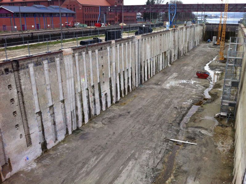 Jetzt kamen die Mitarbeiter des Bereiches Spezialtiefbau zum Einsatz. Sie arbeiteten sich ebenfalls auf den Pontons von oben nach unten und bohrten so insgesamt 550 Löcher in die etwa 14 Meter breite Mittelwand. Da aber immer eine Schleusenkammer betriebsbereit bleiben musste, durften die Löcher nicht ganz durchgebohrt werden. Anschließend wurden etwa dreizehn Meter lange Anker in die Löcher geführt und einbetoniert. Damit war die Voraussetzung zum späteren Verspannen der Vorsatzschalen an der Mittelwand geschaffen. Jetzt konnte die nördliche Schleusenkammer vorübergehend wieder für den Schiffsverkehr freigegeben werden und die Sanierung der zweiten Schleusenkammer beginnen.