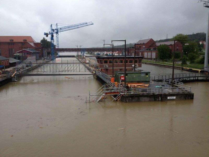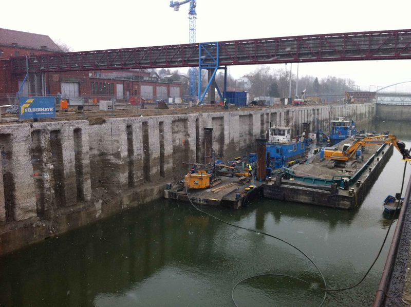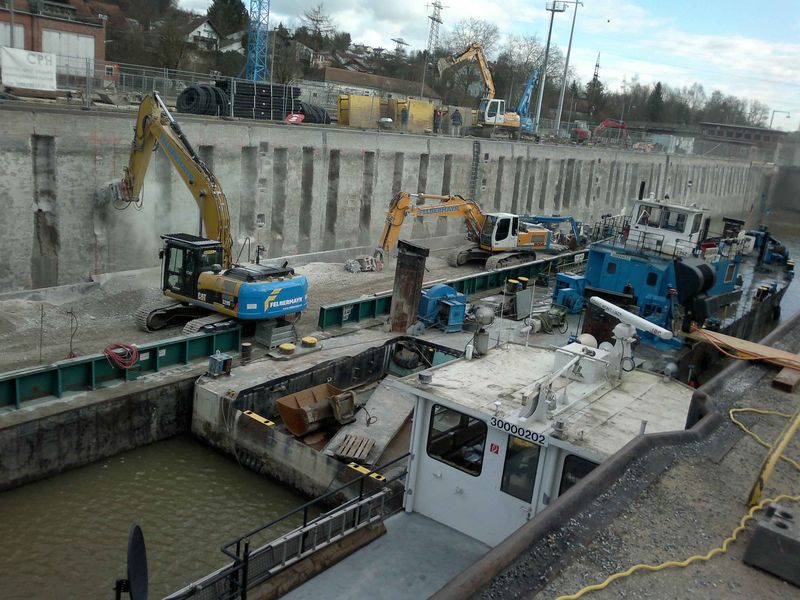 Als die Schleusenanlage des Kraftwerks Kachlet 1927 in Betrieb ging, war sie mit einer Länge von 230 Metern eine der größten in Europas Binnengewässern. Die im Auftrag der Wasser- und Schifffahrtsverwaltung durchzuführenden Sanierungsarbeiten haben bereits im März mit dem Abfräsen der Mittelwand der nordseitig gelegenen Schleusenkammer begonnen. Um von oben nach unten vorarbeiten zu können, arbeiteten die Bagger auf Schwimmpontons des Bereiches Wasserbau. Um die 14 Meter hohe Mittelwand abfräsen zu können, wurde der obere Wandbereich vom Ponton aus abgebrochen. Für die tiefer gelegenen Bereiche wurde von der Sohle aus gearbeitet. Nach etwa vier Monaten war die Wand nach den Vorgaben des Statikers abgefräst und das angefallene Beton- und Gesteinsgranulat entsorgt.