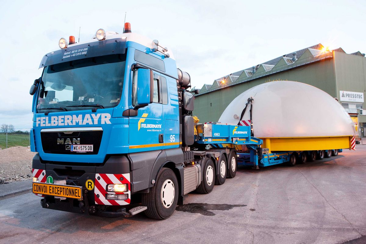 »Dank der sehr kooperativen Verantwortlichen seitens der Asfinag wurden die nötigen verkehrsleitenden Maßnahmen genehmigt«, sagt Trauner dessen Team, zusammen mit dem Transportbegleitungsservice Trummer aus Graz, im Vorfeld diverse Streckenstudien und Begehungen durchführte. Daraus wurde ein exakter Ablaufplan erstellt. Mit einer Länge von 7,76 Metern und einer Breite von 7,51 Meter war die Kuppel gefolgt von Stator und Rotor die größte zu transportierende Komponente. Schon die ersten 25 Kilometer vom Werk bis zur Autobahn hatten es in sich: »Das Ladegut war einen halben Meter breiter als die Straße, deshalb mussten alle Straßenpflöcke entfernt werden«, kommentiert Trauner. Darüber hinaus stellten sich auch zahlreiche Kreisverkehre dem Transport in den Weg, Ampelanlagen und Verkehrszeichen mussten demontiert werden. Noch schwieriger war es bei einigen Engstellen in den Orten. Dort entschieden wenige Zentimeter über das weitere Vorankommen des Transports. »Da waren wir echt am Limit, bemerkt Trauner voll Begeisterung über den letztendlich erfolgreichen Transport. Auch auf der Autobahn waren zahlreiche Verkehrslenkende Maßnahmen einzuplanen. So konnte beispielsweise auf der A2 zwischen Pinggau und Zöbern eine Baustelle nicht geräumt werden. Deshalb wurde auf der Gegenfahrbahn kurzfristig eine etwa zehn Kilometer lange Straßensperre für die Schwertransporte errichtet. Auf dieser war der Konvoi dann sozusagen als Geisterfahrer unterwegs. Nach rund 350 Straßenkilometern und zwei durchgefahrenen Nächten erreichte der Transport dann den Felbermayr Schwerlasthafen in Linz. Im Sinne der praktischen Umsetzung sei auch vor den Fahrern der Hut zu ziehen, schwärmt Trauner über das perfekt Teamwork: »Die sind echt super unterwegs gewesen!«