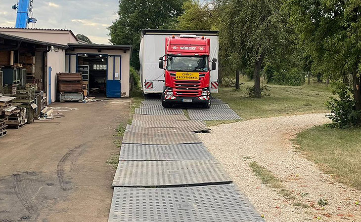 Wie von Pichl erwähnt, erforderte der Sondertransport eine genaue Planung und Sichtung der Gegebenheiten der gesamt 22-Kilometer langen Strecke. Der Transport der Module erfolgte in Richtung Ziel über eine schmale, landwirtschaftliche Straße und mehrfaches Abbiegen war erforderlich. Um zur schwer zu erreichenden Entladestelle zu kommen, musste als Fundament eine temporäre Baustraße aus Stahlplatten für eine Achslast von zehn Tonnen aufwändig hergerichtet werden. Die Fundamentstellungen erfolgten mittels 180-Tonnen-Kran bei einer Ausladung von etwa 19 Metern.