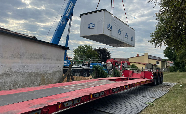 Der auf alternatives Bauen spezialisierte Hersteller von Gebäuden in modularer Bauweise aus Neresheim in Deutschland, stellte für die Erweiterung der Kindertagesstätte in Pflaumloch in der Gemeinde Riesbürg zwei Gebäudemodule bereit. Das größere Modul wiegt bei einer Länge von knapp 15 Metern 26 Tonnen, ist mehr als fünf Meter breit und über vier Meter hoch, das zweite Modul hat ein Gewicht von rund 19 Tonnen und ist bei einer Länge von etwa neun Metern rund fünf Meter breit und mehr als drei Meter hoch. Die Experten von Felbermayr und Wimmer wurden für den rund 22 Kilometer langen Sondertransport von Neresheim nach Riesbürg und die dazugehörige Streckenplanung sowie mit der Fundamentstellung beauftragt.