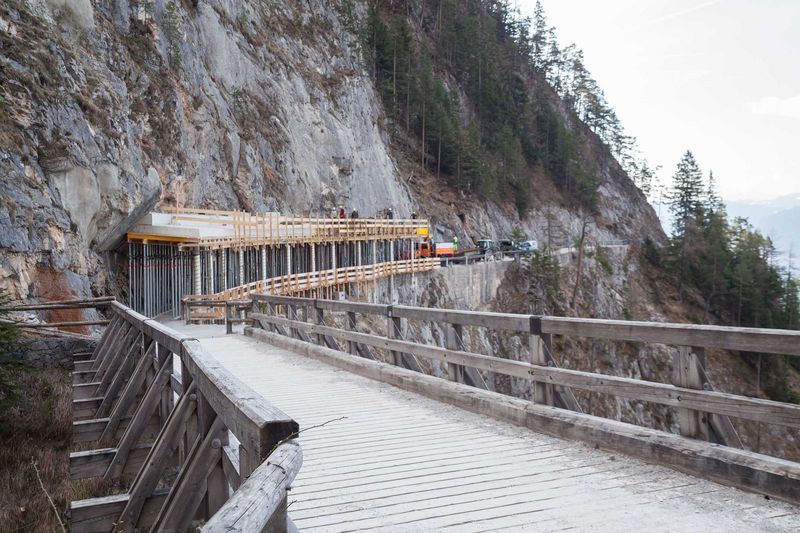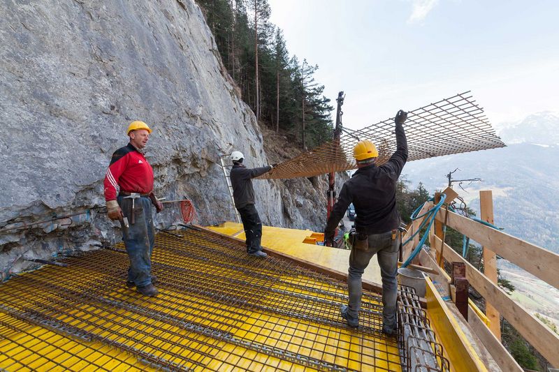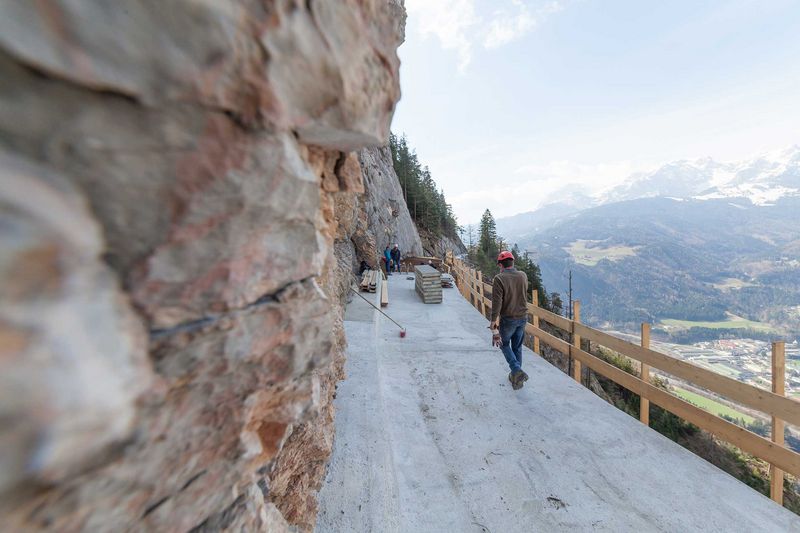 „Wir wussten, dass das nicht einfach wird, doch für uns ist das Standard“, sagt Bauleiter Josef Messner, der es gewohnt ist, zusammen mit seinem Team unter schwierigen geologischen Verhältnissen zu arbeiten. Doch bevor mit dem eigentlichen Bauvorhaben begonnen werden konnte, musste die Baustelle noch gegen Steinschlag gesichert werden. „Dazu haben wir in der 50 Meter hohen Felswand über dem Fußweg zunächst Anschlagpunkte für die Seilsicherungen hergestellt.“ Anschließend erfolgte eine Sicherung der Steinschlag gefährdeten Felsformationen mit Felsankern und Spritzbeton.
