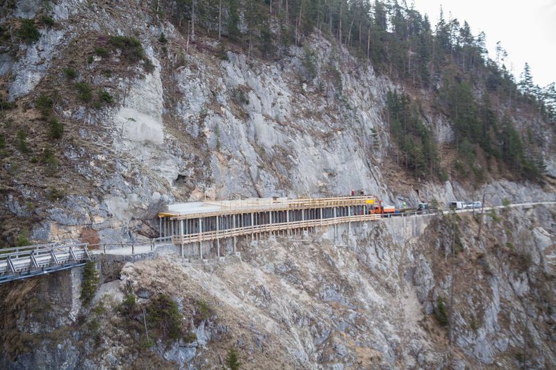 Auf diesen Betonlisenen wurden in weiterer Folge acht Meter hohe Betonsäulen für das Dach der Galerie errichtet. „Zur Rückverankerung des Galeriedaches wurden 47 Gewindeanker mit sieben Meter Länge und 47 Millimeter Durchmesser in den Fels gebohrt und ausinjiziert. Darauf aufbauend wurden dann die Schalung und etwa 20 Tonnen Bewehrung für das Galeriedach angepasst“, erklärt Bauleiter Messner. Auch die zur Baufertigstellung benötigten 130 Kubikmeter Beton mussten wieder über den schmalen Zufahrtsweg mit Mischwägen zur Baustelle gebracht werden. „Mitte April haben wir die Baustelle planmäßig fertiggestellt“, freut sich Messner über die erfolgreiche und unfallfreie Abwicklung. Somit ist auch weiterhin ein sicherer Zugang zur weltgrößten Eisriesenwelt mit ihrem insgesamt rund 40 Kilometer umfassenden Höhlenlabyrinth gewährleistet.