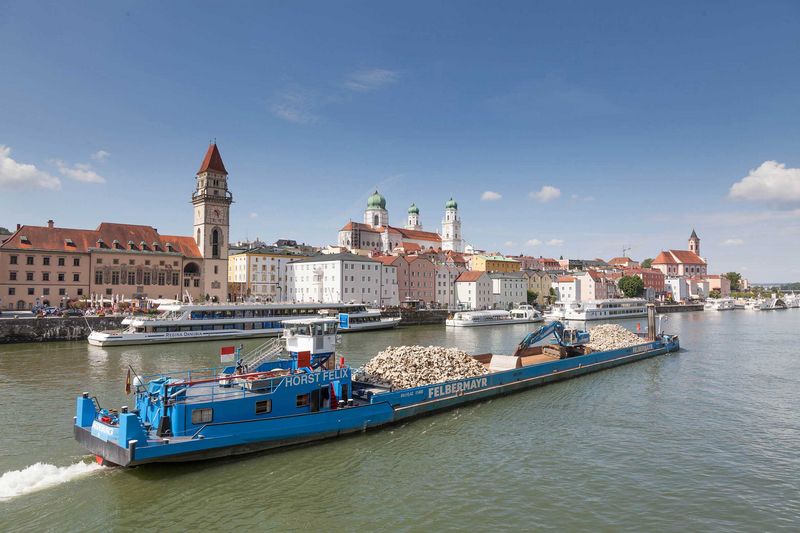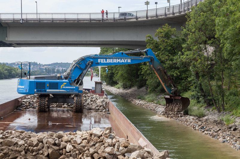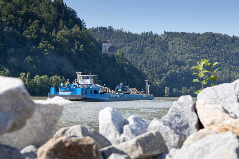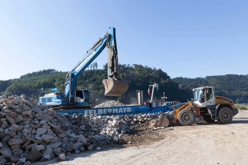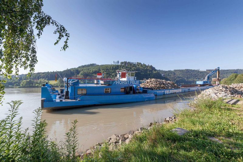 Strömungsbedingt kam es in Passau auf einer Streckenlänge von rund sechs Kilometern zu Auskolkungen im Uferbereich der Donau. Anfang Juni begann der Felbermayr-Wasserbau im Auftrag der Wasserstraßen- und Schifffahrtsverwaltung, diese zu sanieren. „Dazu wurden von einem etwa 30 Kilometer entfernten Steinbruch insgesamt 14.000 Tonnen Wasserbausteine zum Umschlagsplatz nach Erlau transportiert, dort auf das Gütermotorschiff „Horst Felix“ umgeschlagen und etwa 16 Kilometer bergwärts zu den Schadstellen transportiert“, schildert Bauleiter Aleksandar Bozic vom Felbermayr-Wasserbau die logistische Herausforderung.