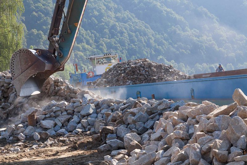 Der Einbau der bis zu 60 Kilogramm schweren Granitsteine wurde unmittelbar vom Arbeitsverdeck des Schiffes durchgeführt. Dafür kam ein 80-Tonnen-Bagger mit Fünf-Kubikmeter-Löffel zum Einsatz. „Die nötige Stabilität für das sichere Arbeiten, erreichte das Schiff durch Ankerpfähle“, erklärt Bozic. Anfang Juli konnte die Baustelle abgeschlossen werden.