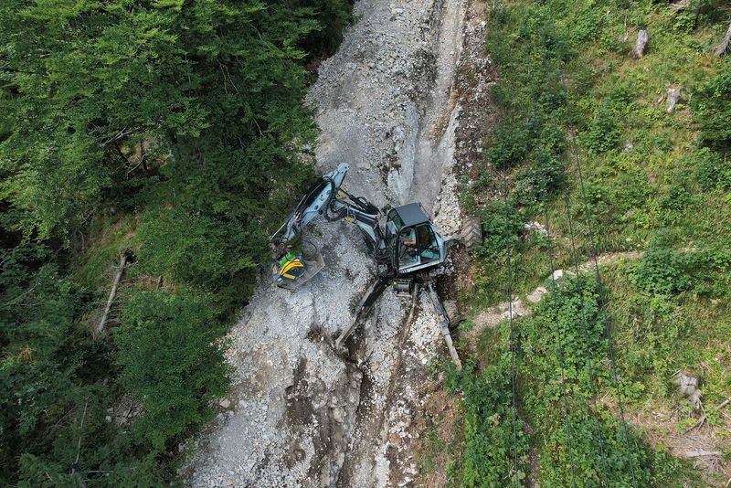 „Die Bauarbeiten sind äußerst fordernd“, sagt Wirnsberger und verweist auf den gleich unter einer dünnen Humusschicht anstehenden Fels: „Um den Dachsteinkalk mit dolomitischen Einschaltungen auf die geforderte Tiefe von etwa 1,7 Metern ausfräsen zu können, kommen Gesteinsfräsen zum Einsatz.“ Doch nicht nur das Material ist fordernd, auch Steigungen von bis zu etwa 20 Prozent machen die Arbeiten schwierig. Um diese Passagen meistern zu können, kamen durch Seilwinden gesicherte Schreitbagger zum Einsatz. „Bei diesem Gerät sind am Unterwagen vier Schreitbeine mit Rädern angebracht. Diese können sowohl horizontal als auch vertikal und in der Länge an die Hanglage angepasst werden“, erklärt Wirnsberger die Besonderheit dieses Gerätes. Doch trotz der Möglichkeiten müsse man in diesem schwierigen Gelände eine geringe Tagesleistung in Kauf nehmen. So seien beispielsweise bei anstehendem Fels nur etwa zehn bis 20 Meter pro Tag möglich.