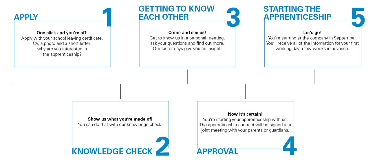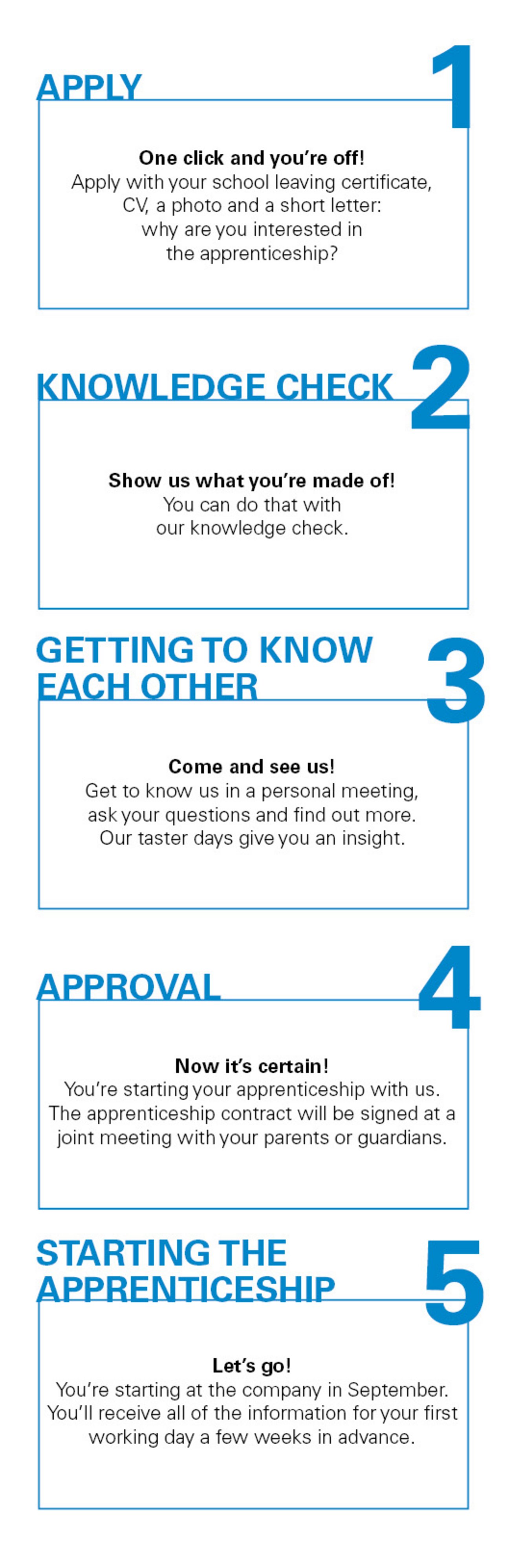 You’ve chosen your own path and want to leave school early? No problem – we value dedication, the will to learn and team spirit. If you’re motivated and really want to make things move, you’ve come to the right place!