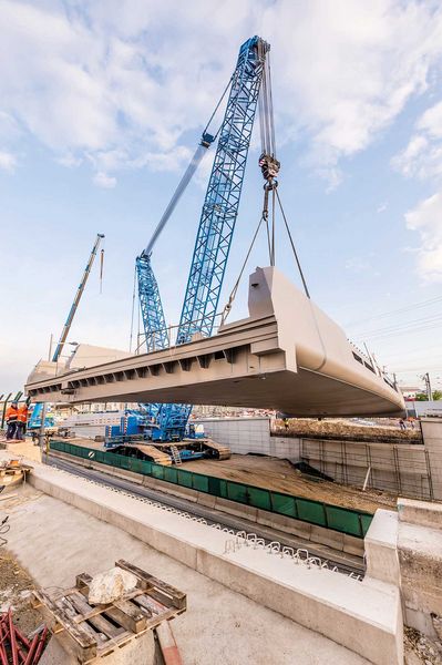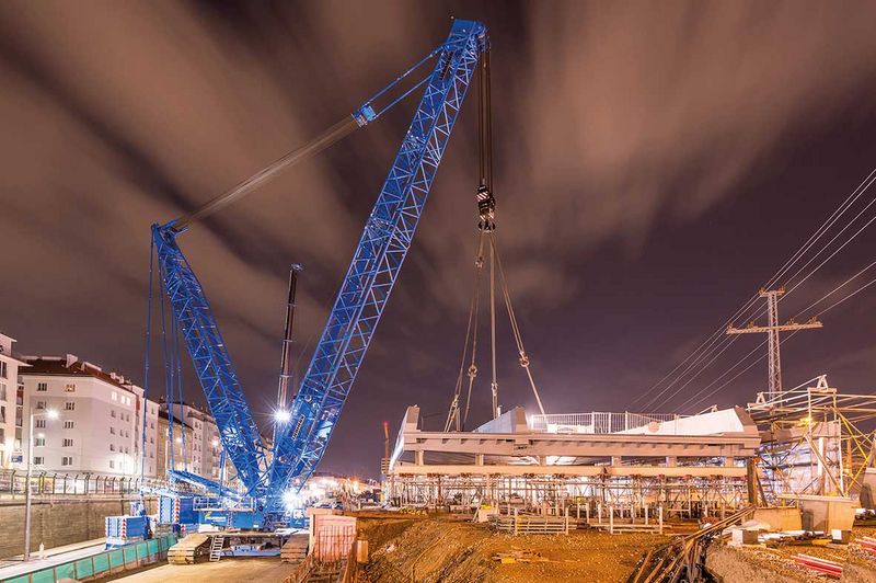 A time window of a mere five hours had been reserved for the lifting process itself. “We started at midnight, right after the last tramway had passed,” says Lehner and identifies the restricted space available as one of the greatest challenges. Once the team had removed a catenary, the bridge could be connected to the pulley. After that, the crane – carrying the bridge – rotated to the right by about 50 degrees. Later, the crawler crane had to be moved 20 metres to reach the bridge’s support points. Thanks to excellent weather and wind conditions, the crane operator had no problem following the spotter’s instructions for he could not see the bridge’s support points. Lehner comments that “wind speeds of more than 12 metres per second would have prevented us from lifting the bridge into place as the load could have started becoming unstable and could have endangered the operation.” However, thanks to absent wind (a rather unusual thing for Vienna), the 245-tonne bridge could be lifted into place without any safety concerns by the crawler crane weighing 755 tonnes. The following months will see the completion of necessary traffic infrastructure meaning that the bridge will most likely be opened for traffic at the end of this year. Vienna’s Municipal Department MA29 which is responsible for bridge construction and foundation engineering functioned as the client for this lifting project commissioned by Swietelsky.