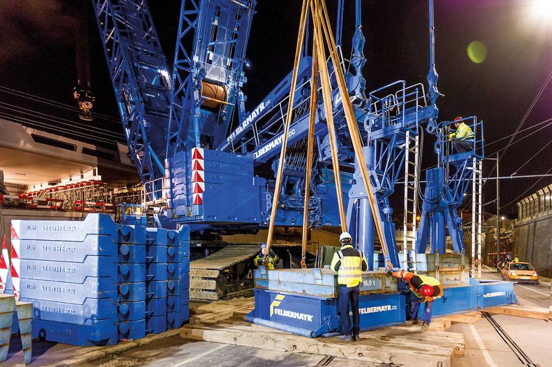38 lorry transports were required to remove the crawler crane with its maximum load capacity of 750 tonnes. “Our set-up time for the steel giant with 485 tonnes of ballast was a mere three days,” Michael Lehner from Felbermayr Transport and Lifting Technology reports. A mobile crane with a load capacity of 200 tons was used to assemble the crane on site. In the end, the crane was equipped with a 42-metre main boom and 31.5-metre derrick boom to optimally transfer the weights onto the suspended ballast.