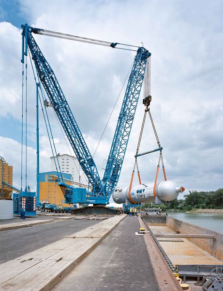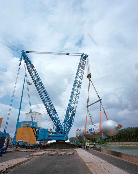 More than 40 trucks were required to bring the LR1600 to the operating site in Albern harbour. With a charge weight of around 780 tons, the high-tech machine has a 600-ton load capacity. That is roughly the same weight as 500 medium-sized cars. "During unloading of the 382-ton column, the 42 metre-long main boom achieved a radius of 16 metres," explained Wimmer. It then reversed six metres with a suspended load, and subsequently swung roughly 65 degrees to the left, in order to finally place the load on the low-loader. It all seemed to happen in slow-motion. A 180 m² driving surface was designed with pieces of red ironwood to ensure the best possible weight distribution. The mass was distributed suitably on it, with the weight of the crane and column being optimally channelled into the ground below. After just over an hour, the lift was complete and the load was placed on to an 18-axle low-loader. Now the load could begin to be secured for the journey that lay ahead.