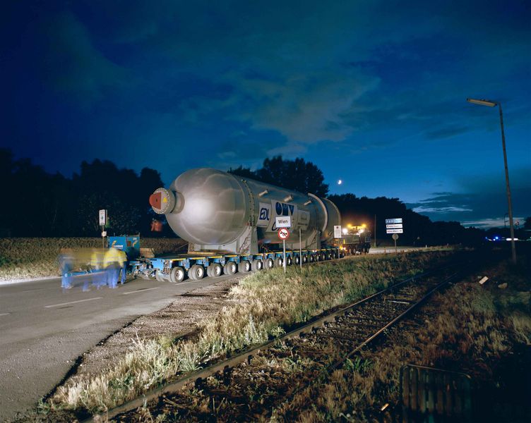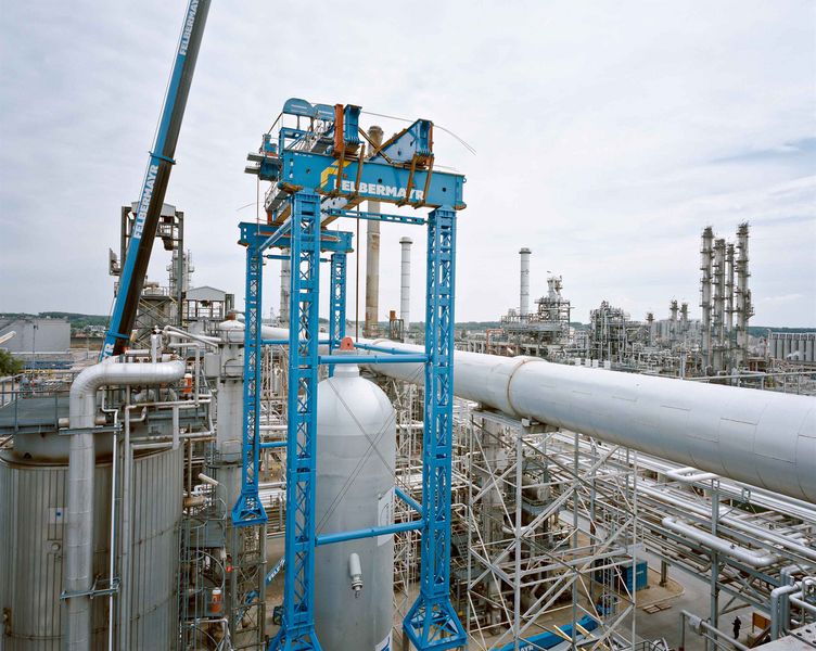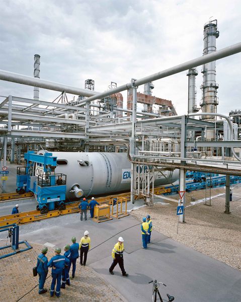 Due to the conditions of the ground and the limited working space, the load could not be lifted using a crane, so a tipper provided the big finale instead. "Our colleagues from Heavy Equipment in Krefeld achieved something brilliant," said Wimmer. This was because a 36 metre-high Towerlift was required to turn the column using the tipper. As part of a week-long process, some 160 tons of steel were used. The tipper was mounted to the bottom end of the container for the final positioning of the base. The Towerlift's strands were attached to the top end. Using lifters, the strands were pulled upwards and the SPMT followed steadily, while the container was brought vertically over the tipper. "This process took roughly five hours," noted Wimmer. The tipper was then detached from the SPMT and the column was lifted up. It took roughly five hours until the reactor moved around eight metres to the side using the rail-mounted Towerlift, turned 36 degrees and could be set on the base. With that, the process was successfully brought to a close with a technically demanding finale.