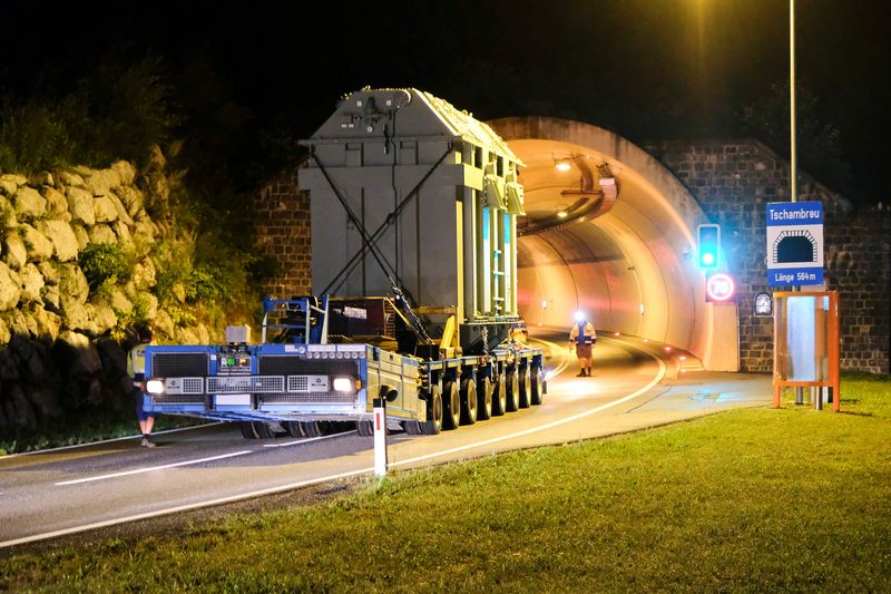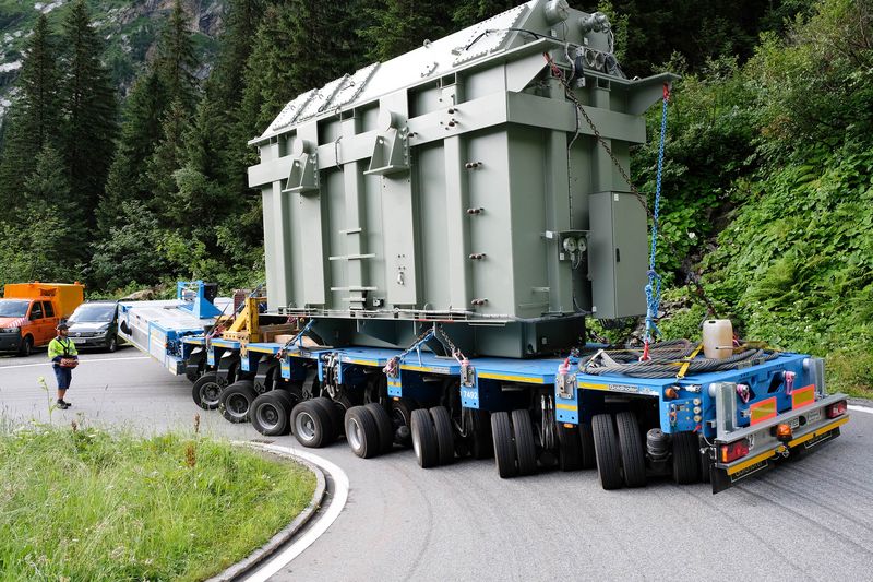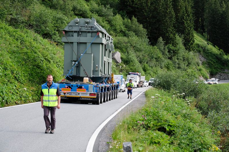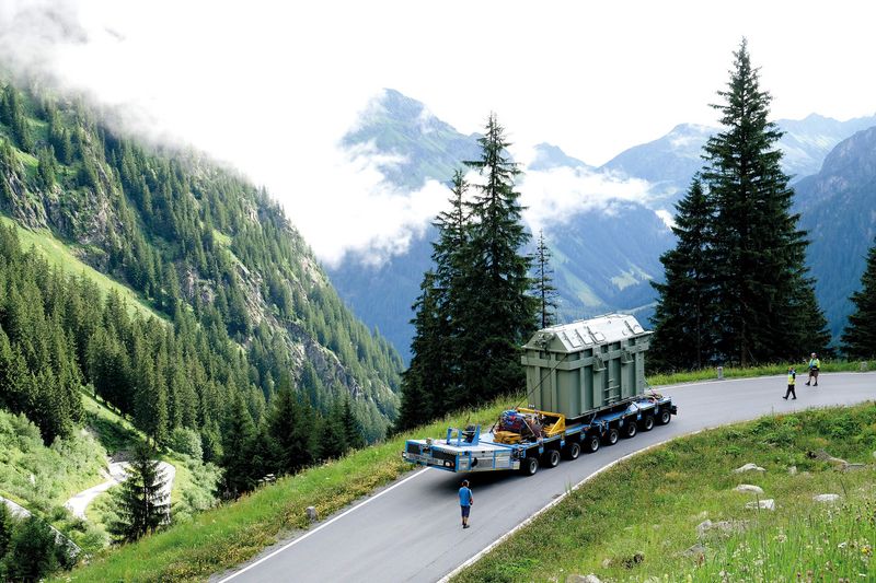 The thirteen heavy load components originated in Austria, Switzerland and Italy. The energy provider’s premises, about ten kilometres south-east of Bludenz, served as a transshipment point and for the final assembly of some components. The three transformers, two of which weighed 152 tonnes and one 77.5 tonnes were produced in an Upper-Austrian transformer factory. The heavier voltage transformers were delivered by rail to the Montafon region. The lighter of the two could be delivered by road due to its lower weight.