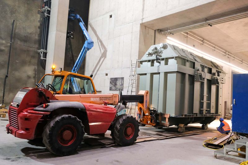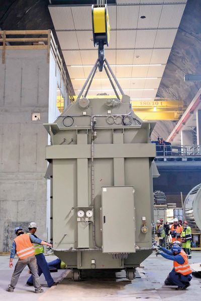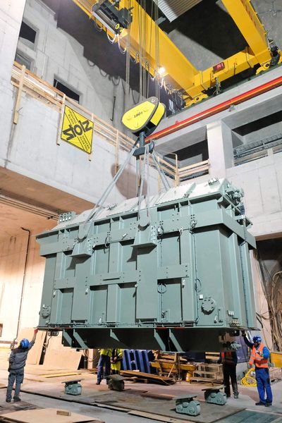 The components were then unloaded in the machine cavern using a gantry crane. The transformers were then put onto their foundations by Bau-Trans employees. The voltage transducers were moved into the transformer cavern by means of so-called gripper pulleys on a rail system, laterally, about 60 metres, and then fixed.