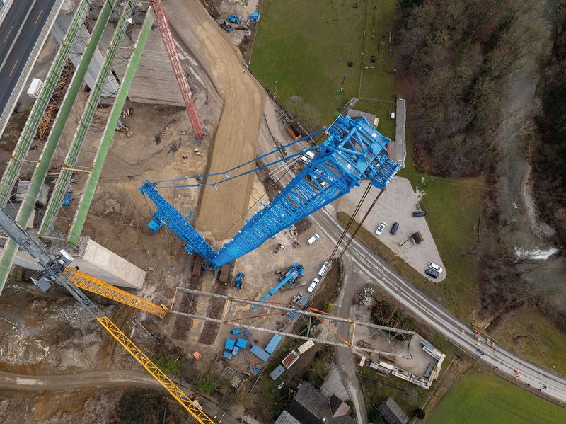 During the deployment period, which lasted around four weeks, spectators had the chance to marvel at “Bug Blue” in its various dimensions at three different locations. This was because it was necessary to change the position and configuration of the crawler crane twice in order to remove the 420-metre-long steel girders that had been towering over the Aurach valley for more than 60 years. In order to lift the first two 70-metre-long and 120-tonne elements, the 1,000-tonne crane was outfitted with a 66-metre-long main boom and 150 tonnes of additional ballast. "The different lengths and weights of the bridge sections and the local conditions meant that there were different requirements at each position, which we handled with the appropriate configuration," explains Lehner. The project preparation therefore not only included technical feasibility, but also a substantial logistical effort. Route permits for the special transports across the motorway had to be obtained in advance and the parking spaces on the motorway and in the valley with limited space had to be prepared. Each time, it took four to five days before the gigantic crane with a tare weight of up to 1,500 tonnes was ready to be lifted to the next position.