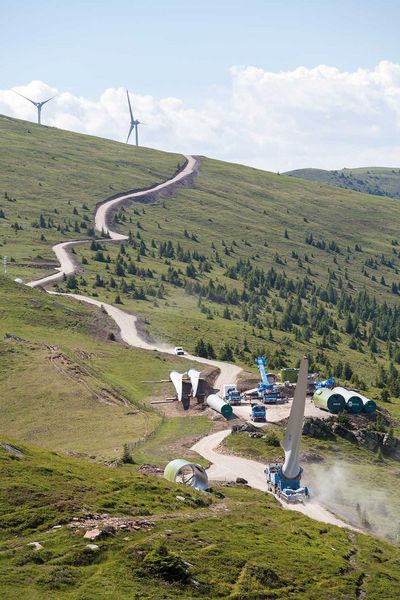 Little wonder considering the fact that the transshipment site for the components weighing up to 67 tonnes is already located 1,400 metres above sea level. From there, a comfor- table country road of 2.35 kilometres heads off in the direction of the construction site. After that, one has to negotiate a two-kilometre logging road. The last seven kilometres to the wind power construction site 1,700 metres above sea level are covered on a temporary road. This translated into difficult conditions and great challenges that can only be overcome using special transport vehicles.