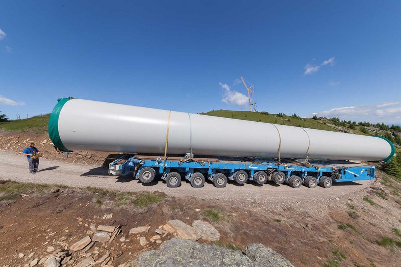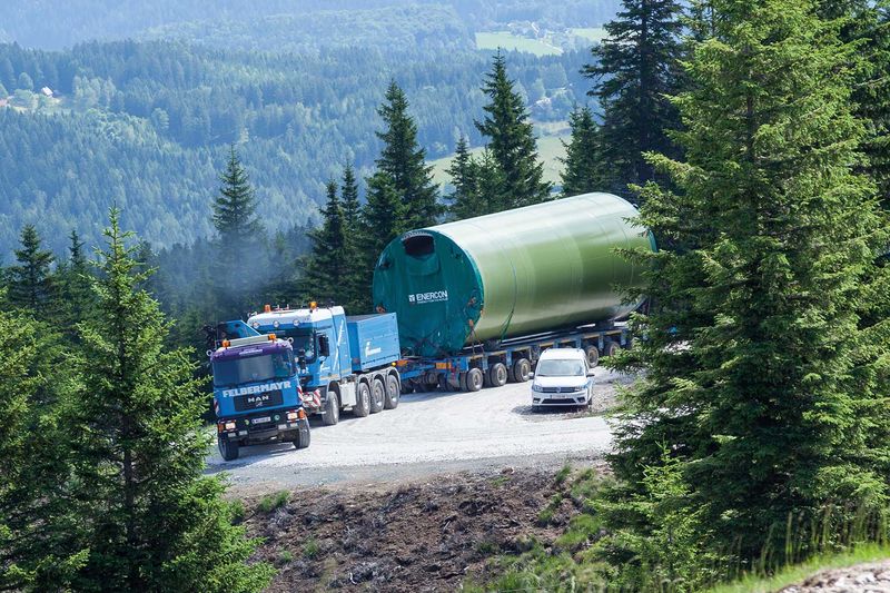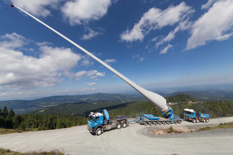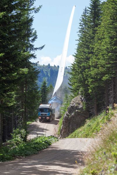 Even though the long-distance transports had many roundabouts and signal systems in store, transporting the components in the mountains posed the greatest challenges, says Wimmer. After all, the team had to negotiate tight corners and gradients of up to 20 per cent. Thanks to the blade lifter, the blades can be raised by 60 degrees. This makes it possible to negotiate tight corners lined with trees. Eight heavy haulage axles, pushed and pulled by two heavy haulage tractor units provide the required weight distribution and traction to drive in this difficult terrain.