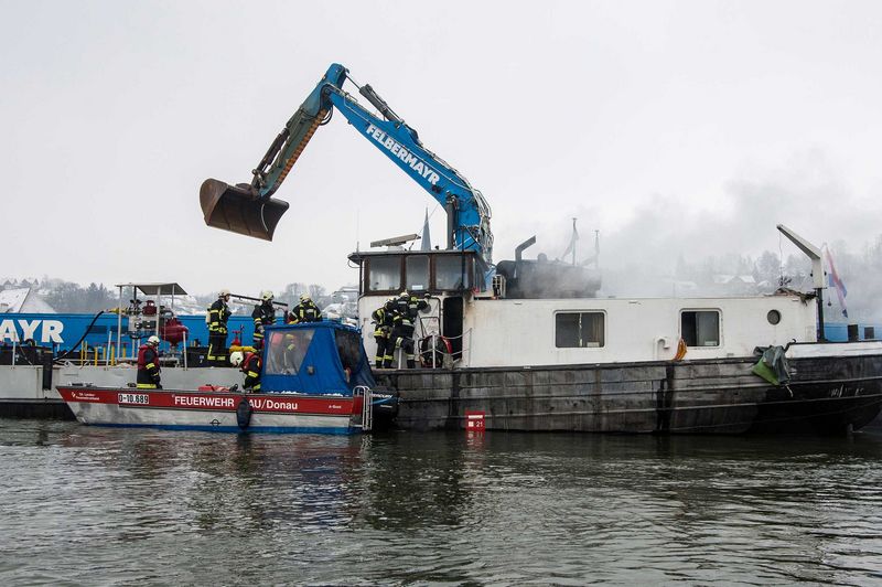 While the fire brigade were still occupied with preparing to extinguish the fire, the captain reacted by steering the ship backwards to those in charge of the emergency response, and offered his help. The fire service commander boarded the "Horst Felix" within seconds and they approached the stricken vessel. "At this point, flames were already rising from the engine room," says Feirer as he describes those dramatic moments. The ship had 340,000 litres of fuel on board, so urgent action was needed in order to prevent a much bigger environmental catastrophe. Dark smoke was rising as the "Horst Felix" approached the ship. The machinist on the excavator, plunged the shovel deep into the Danube and, in one motion, scooped up eight cubic metres of water from the river, swivelled to the other side, and let the water shower down over the cabin in a deluge. This extinguished the fire to a great extent and prevented the flames from spreading to the fuel. For safety reasons, the excavator operator repeated this procedure several more times until the fire service commander reported to his team that the fire had been extinguished. All three members of the ship's crew were rescued and escaped injury.