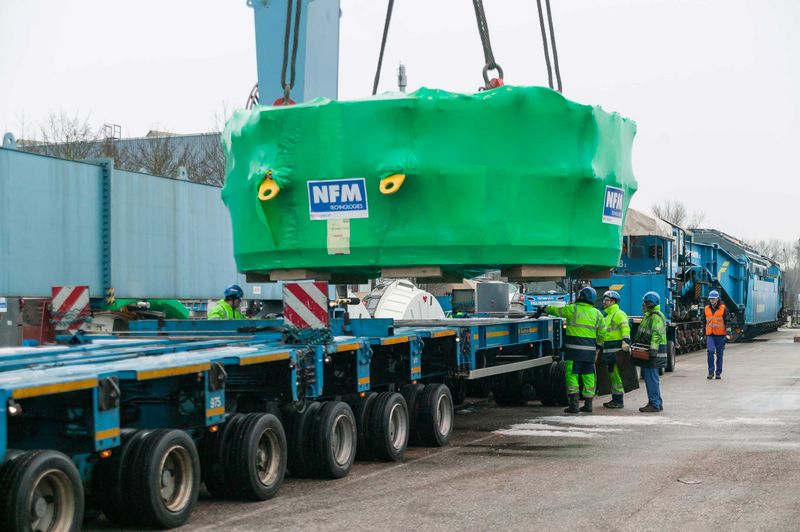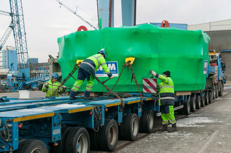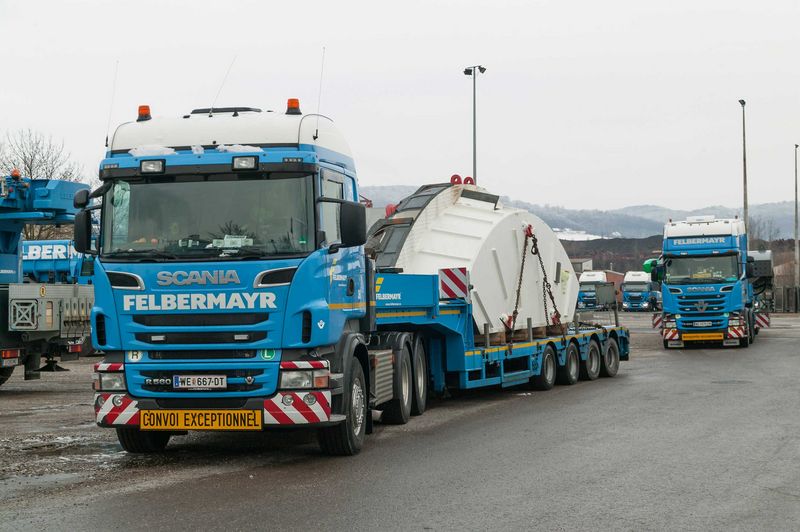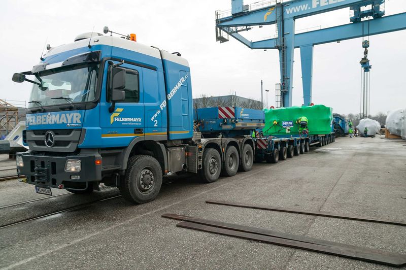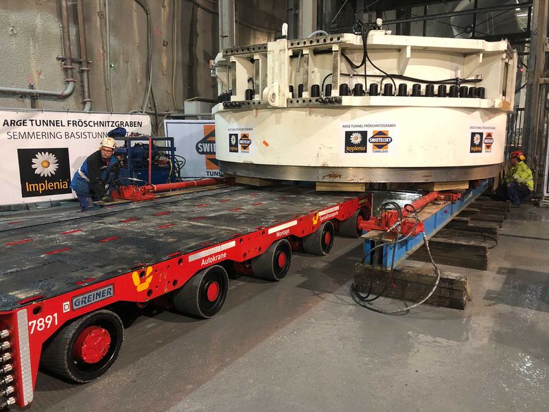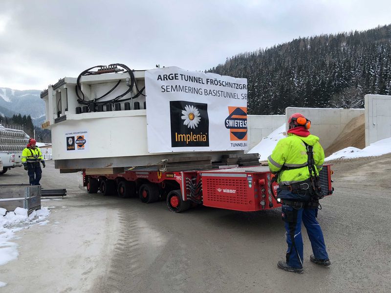 Some 100 transports weighing in at a total cargo weight of approximately 2,500 tons were required to haul the first of two tunnel boring machines from Le Creusot (F) to the construction site in Steinhaus am Semmering (A). “Following a road section leading to the Straßbourg port, our subsidiary Haeger & Schmidt took over the cargo,” reports Roland Füreder from Felbermayr’s Heavy Haulage Department. After that and using a barge, the components were transported to the heavy cargo terminal in Linz, where they were stored temporarily, via the Rhine-Main-Danube Canal. This was followed by further road transport to the construction site at the Semmering pass which were concluded in February. This was mainly done using modular heavy load trailers with so called THP axles. The cutter head, at 115 tons the heaviest part, was transported on 14 axle modules.