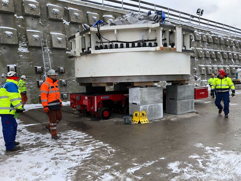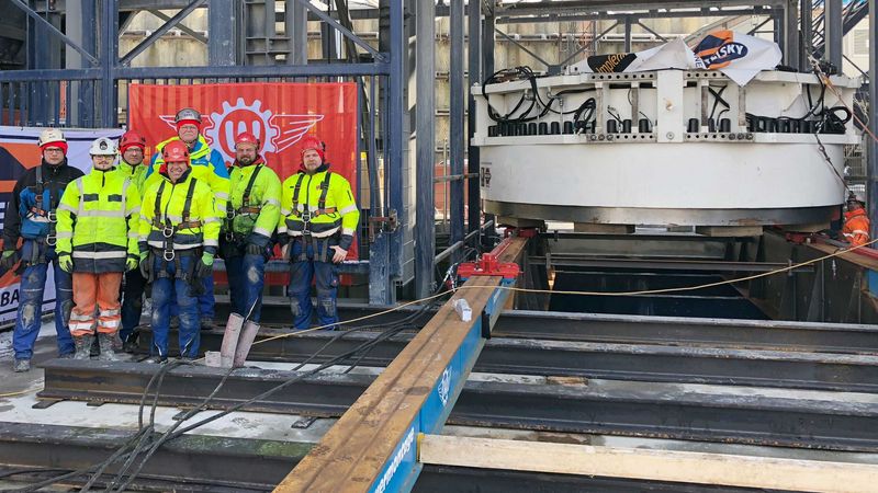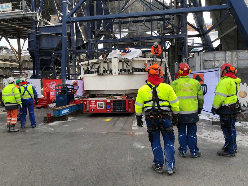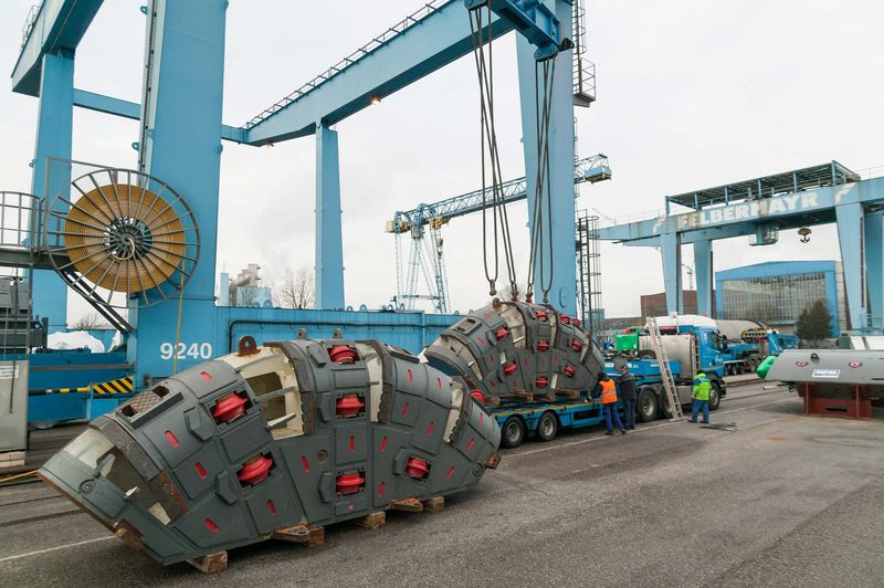 The transport of individual parts from the storage site to the shaft lift was performed using two so-called Sefiros (self-propelled industrial rollers). At the storage site, the components were transshipped using a mobile crane. “For the hydraulic shifting of the components weighing in at many tons into the lift we built a twelve-metre-long skidway,” Stegmann explains. Following their “descent”, the parts were once again taken out of the lift using another skidway. To negotiate the last few metres to the tunnel boring machine’s installation site, the parts were transshipped by means of a Sefiro. Thus, the prerequisites for the tunnel boring machine’s final assembly were established in late February.
