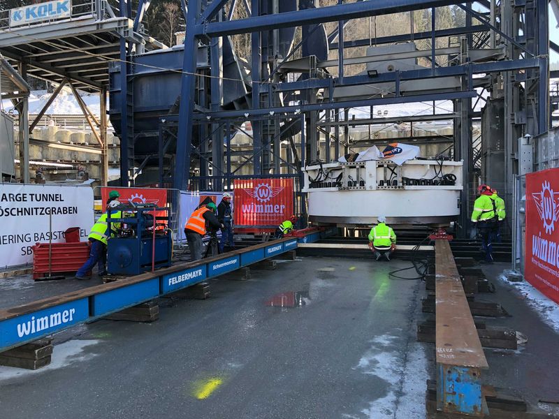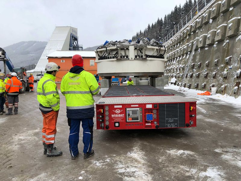 400 metres of elevation separate the tunnel boring machines’ origin in Le Creusot and their destination at Fröschnitzgraben 828 metres above sea level. The Wimmer Maschinentransporte team had to overcome the same challenge once more. Not horizontally, but vertically. And that is what made the whole thing so difficult. Wimmer Maschinentransporte’s Managing Director Holger Stegmann: “Although there was a shaft lift, it was only approved for loads of up to 90 tons. The heaviest part we had to bring into the tunnel weighed more than 100 tons, however. The solution was to remove all unnecessary parts of the lift. In the end, there was not much left of the shaft lift apart from its base frame,” Stegmann illustrates the result.