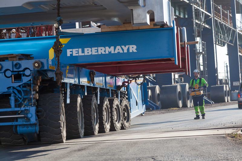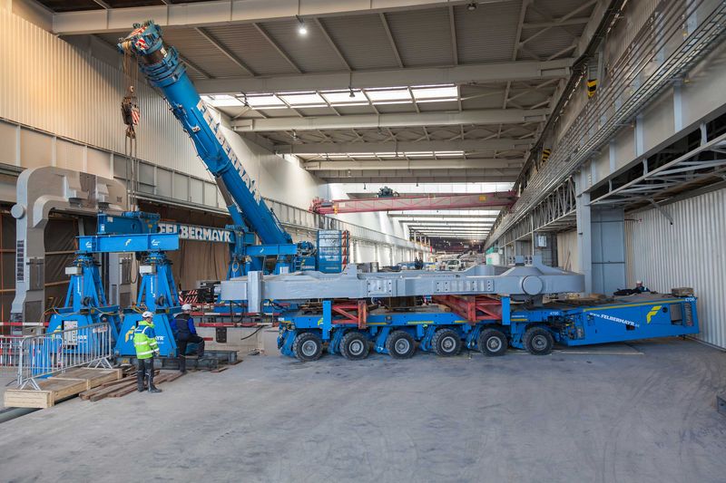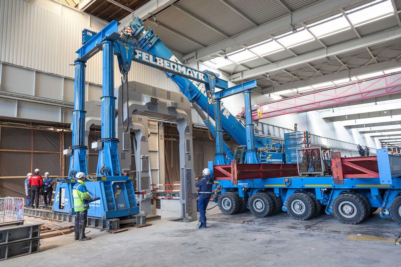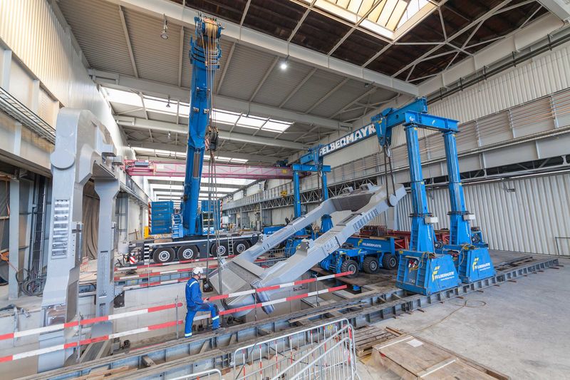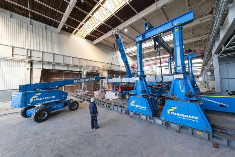 A self-propelled transporter,a lifting frame and a mobile crane as well as forklift trucks and work platforms were used to transport and position the two roll stands, each weighing 130 tonnes, on their foundations. But this was only possible through the know-how of all the companies and their staff involved in this operation. “Planning for this project started about a year ago”, stated Herbert Gruber who works for Felbermayr in Linz, illustrating the large amount of time devoted to this project.