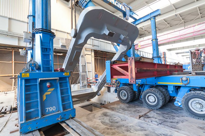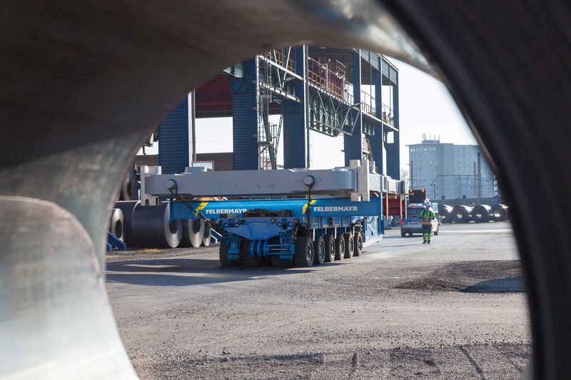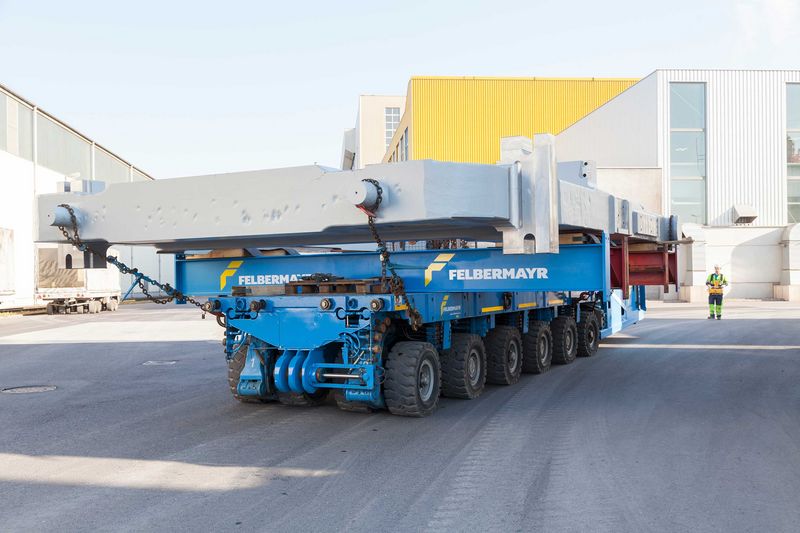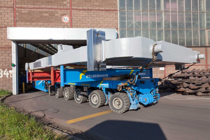 A six-axle self-propelled transporter was used for moving the stands inside the steel mill. This was needed to provide the stands measuring six metres wide and over ten metres long with sufficient bearing surface. Its engine developed 478 hp, enough power, therefore, to move the 130 tonne roll stands to their destination from where they were manufactured just a few kilometres away.