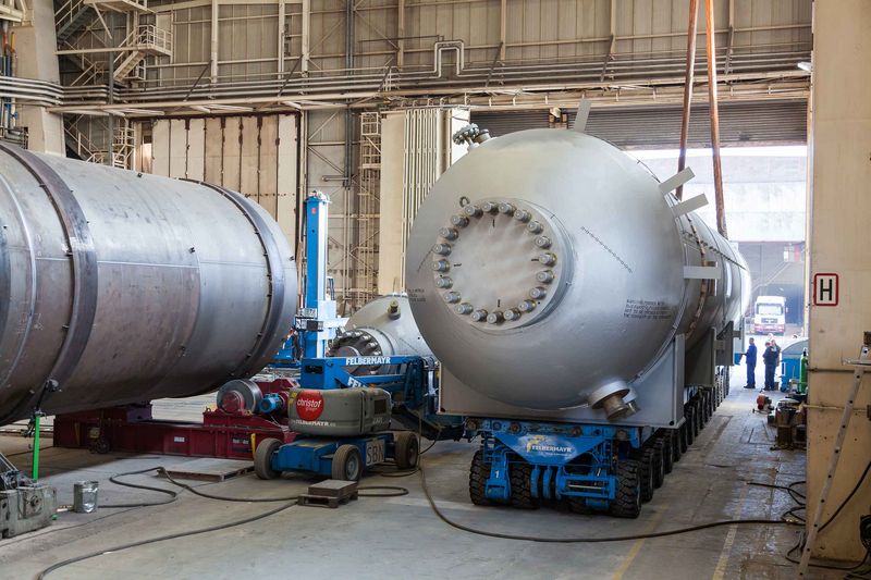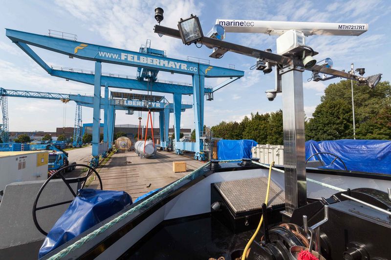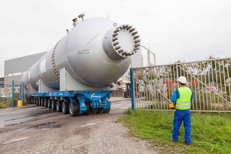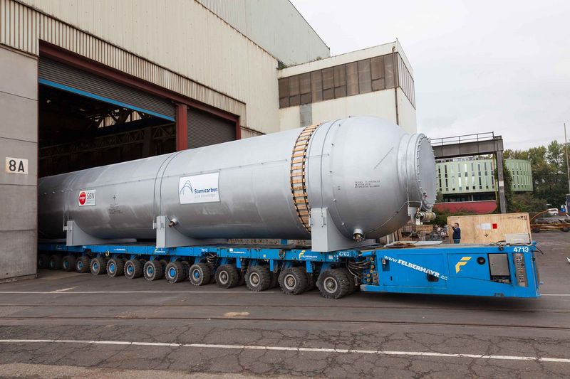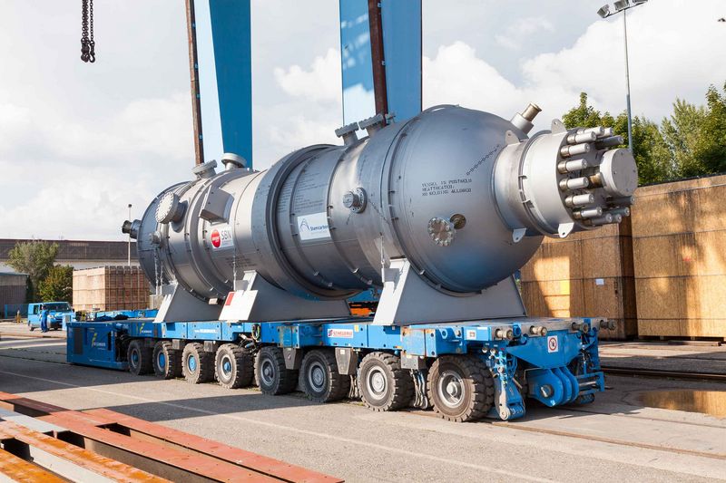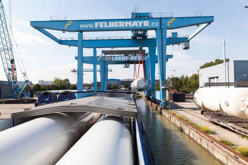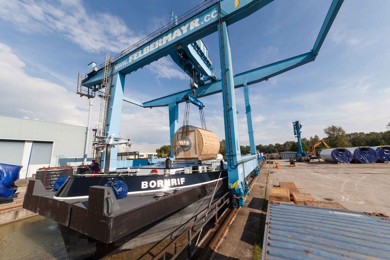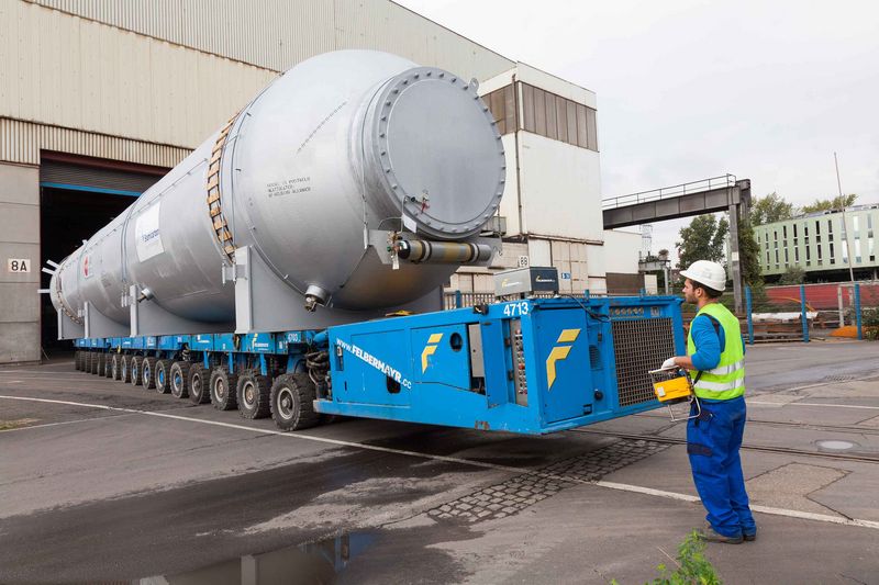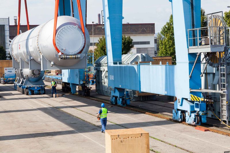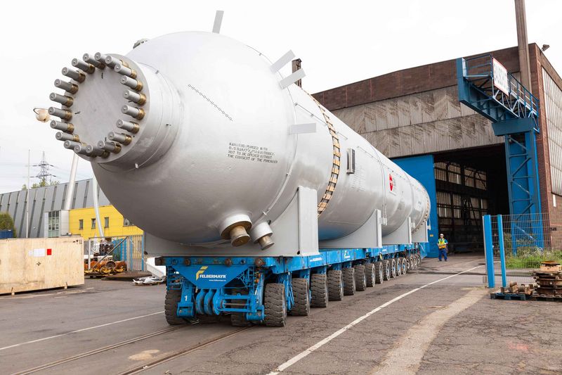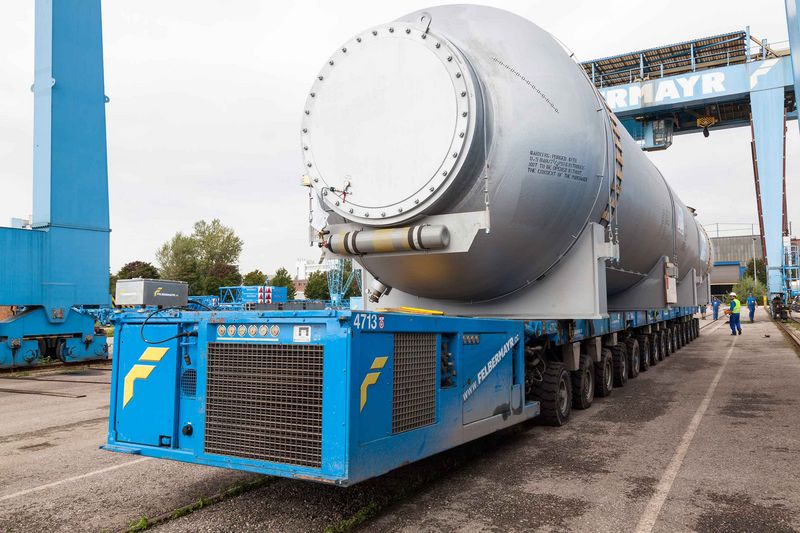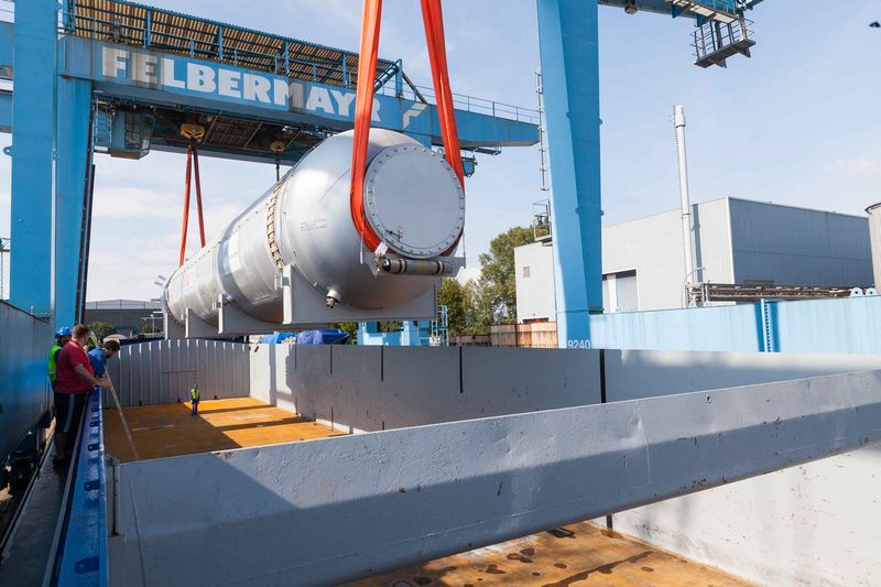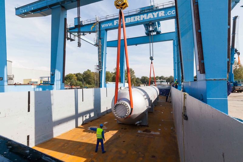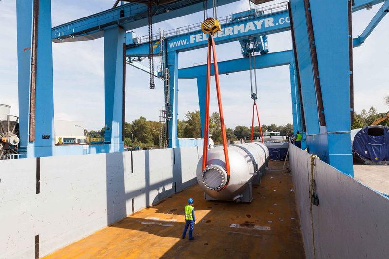 Two gantry cranes with 400 and 200 tonnes of lifting capacity are available at the inner harbour. With both combined, loads of up to 600 tons can be manipulated. Both cranes were used in combination to handle the 380 tonne tank. Its little brother, still weighing in at a hefty 150 tonnes, was subsequently transported from the manufacturing hall to the inner harbour by means of an 8-axle SPMT and loaded onto the inland water vessel. The two were accompanied on their way to Antwerp by two additional components of roughly 130 and 240 tonnes. Thanks to optimal planning, the ship could sail on the very same day. "By the way, the nine-day journey to the Belgian port of Antwerp was realised by Felbermayr's subsidiary company Haeger und Schmidt based in Duisburg," Steinbrecher adds. Final destination of the two tanks is a factory in Texas. There, the high-tech steel giants are used in a plant manufacturing nitrogenous fertiliser.