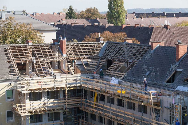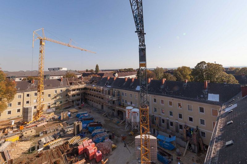 Additionally, construction also includes the creation of 50 new flats on the attic floor. “For this purpose, we will first remove the roof truss,” says Grundner. The materials removed will be submitted to the recycling process. Following this, the existing exterior walls in the courtyard will be bricked up by some three metres and dormers will be created to increase the size of the flats.” A positive side effect of these expansion efforts is the fact that the buildings will receive a fourth floor. This also means that 25 lifts have to be retrofitted to the complex. This would not have made economic sense with the previous threestorey layout, according to the housing development association. From the lifts, the flats will be accessed via the protruding loggias. Much to the satisfaction of many tenants, this also allows for barrier-free access to all four floors.