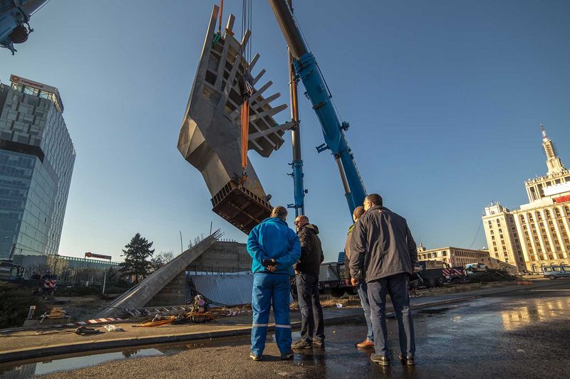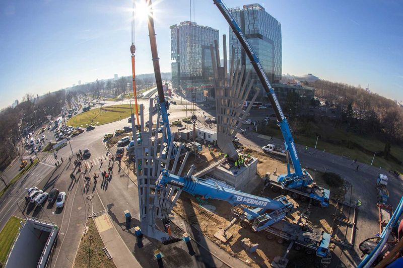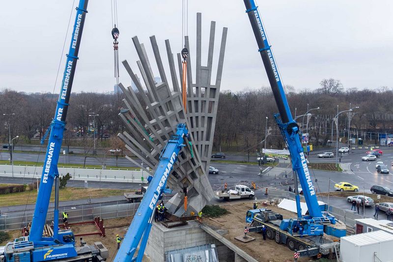 „Proiectul datează din 1999”, explică Marius Tudose, din cadrul filialei din Bucureşti a Felbermayr. La momentul respectiv, Ministerul Culturii a organizat un concurs. Obiectivul a fost de a găsi un simbol a luptei anticomuniste. Rezultatul - trei structuri în formă de aripă, în oţel. Lucrarea de artă are 20 de metri înălţime şi peste 100 de tone în greutate.