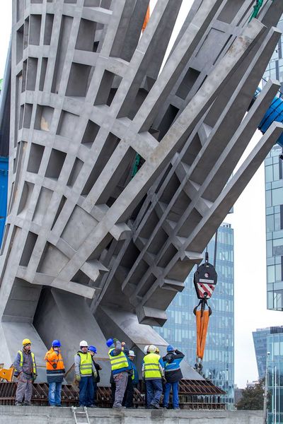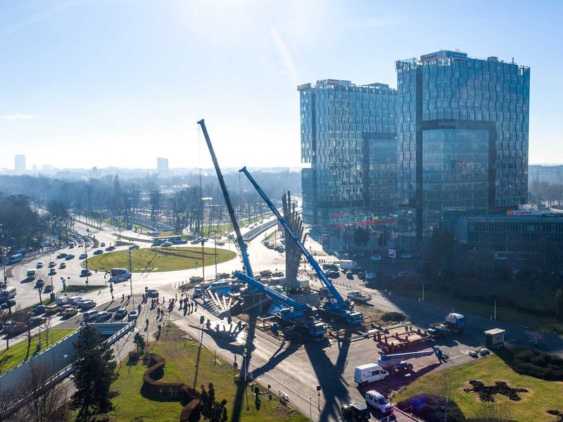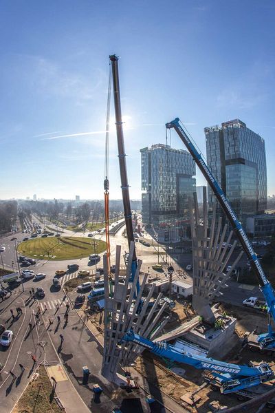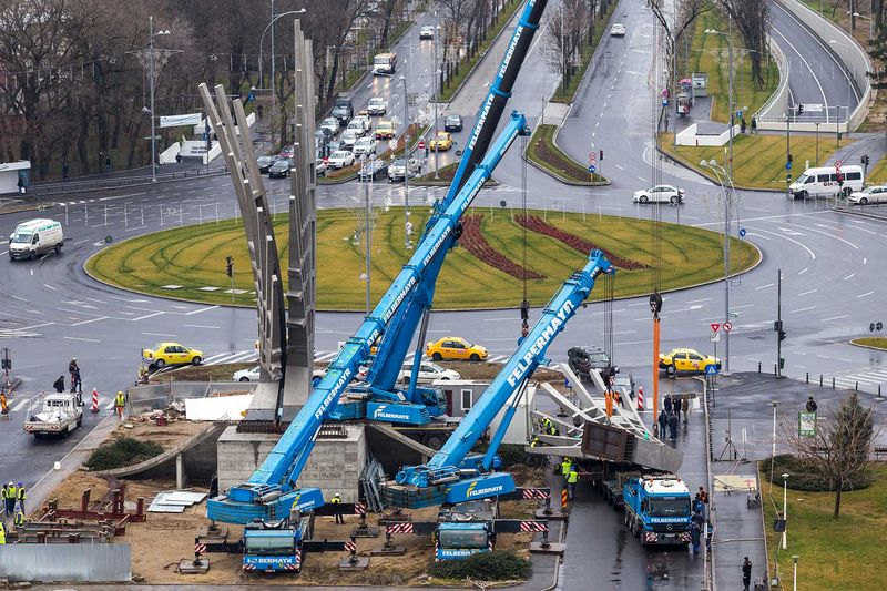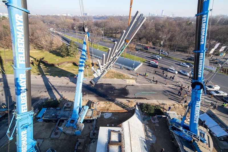 Specialiştii de la Felbermayr au avut de contracarat alte provocări la destinaţie. În acest punct a ieşit în evidenţă adevărata complexitate a geometriei neregulate a aripii. În consecinţă, s-au utilizat trei macarale simultan pentru fiecare dintre cele trei elemente: Deoarece acestea trebuiau rotite în aer, pentru a permite amplasarea sigură şi corectă a aripilor în fundaţie. Aceasta a necesitat studii detaliate prealabile. Acestea au fost reprezentate prin animaţie pe computer. Cu toate acestea, pentru a permite realizarea în practică a complexităţii ridicărilor, a fost creat în avans un mare număr de animaţii pe computer. Cu toate acestea, transpunerea în practică a fost incitantă. Aşa cum a arătat şeful echipei Felbermayr, Gabriel Puşcoiu, „La asemenea proiecte, nu poţi exclude niciodată diferenţa dintre teorie şi practică.”