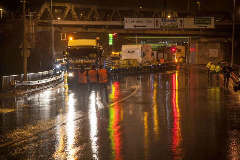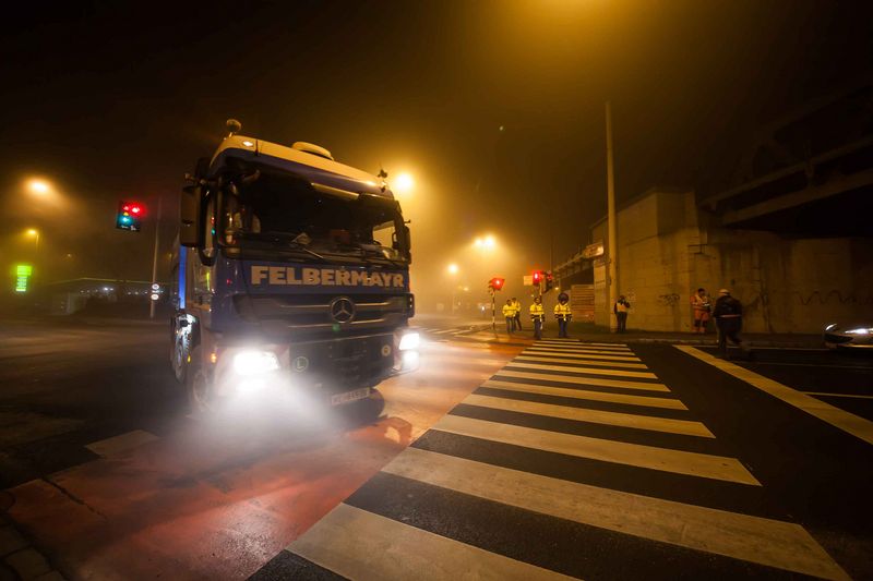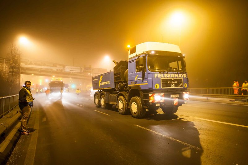 Două unităţi pe role, fiecare cu o lungime şi lăţime de opt pe cinci metri, au început transportul rutier la jumătatea lui decembrie. „Din cauza greutăţii de circa 200 t, componentele au fost transportate în convoi, pe două încărcătoare cu platformă joasă şi 20 de punţi”, explică Jürgen Steinbrecher de la departamentul de transport, cu sediul la Wels. Primul obstacol aştepta deja echipa de transport cu numai câţiva kilometri în afara portului. Un pod de 100 m lungime a trebuit traversat „cu spatele”, din motive statice. „Aceasta a implicat tractarea pe diagonală a încărcătorului cu platformă joasă pe drum, utilizând două vehicule de remorcare” spune Steinbrecher, explicând procedura pentru o mai bună distribuţie a greutăţii. Din fericire, alte şaisprezece poduri au putut fi traversate fără măsuri speciale. Dar, după circa 90 km a venit ieşirea de pe autostradă la Ort im Innkreis şi, o dată cu aceasta, un pod peste A8, care nu a putut fi traversat din cauza greutăţii totale de 305 tone a transportului. „Ca soluţie, am decis să ieşim pe drumul auxiliar, fără pod”, spune Steinbrecher. Condiţia în acest sens a fost blocarea temporară a secţiunii autostrăzii şi demontarea delimitatoarelor centrale pentru schimbarea benzii de trafic. După aproximativ trei ore, autostrada a putut fi redeschisă. Un alt convoi, format din două transporturi, a urmat la jumătatea lunii ianuarie, iar transportul a putut fi executat conform planului. Componentele grele vor fi utilizate pentru un nou laminor de ţevi la cald. Clientul proiectului de transport este compania de inginerie mecanică Danieli.