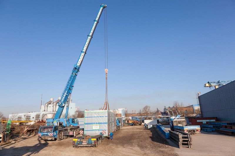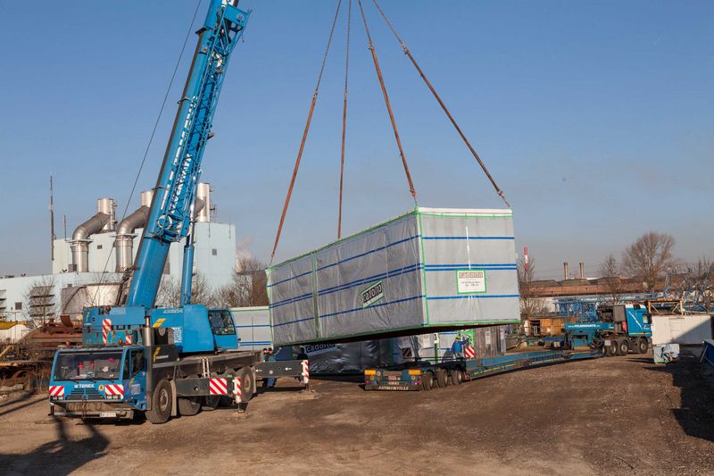 Din cauza spaţiului limitat din locaţia de la spitalul Wilhelminenspital, nu s-au putut transporta toate modulele de la fabrica producătorului din Cadolzburg în Bavaria direct la Viena. „Livrarea de tip exact la timp a reprezentat marea problemă a acestui proiect”, spune domnul Füreder, explicând că 81 din cele 210 module de încăpere au fost depozitate temporar la depozitul pentru mărfuri grele al Felbermayr din Linz şi transportate la Viena la cerere. Din cauza reglementărilor regionale, spitalul Wilhelminenspital era accesibil numai între miezul nopţii şi ora cinci dimineaţa. „Din acest motiv, transporturile directe au luat o pauză la Suben”, precizează domnul Füreder, explicând astfel timpul de transport de opt-nouă ore de la Cadolzburg la Viena.