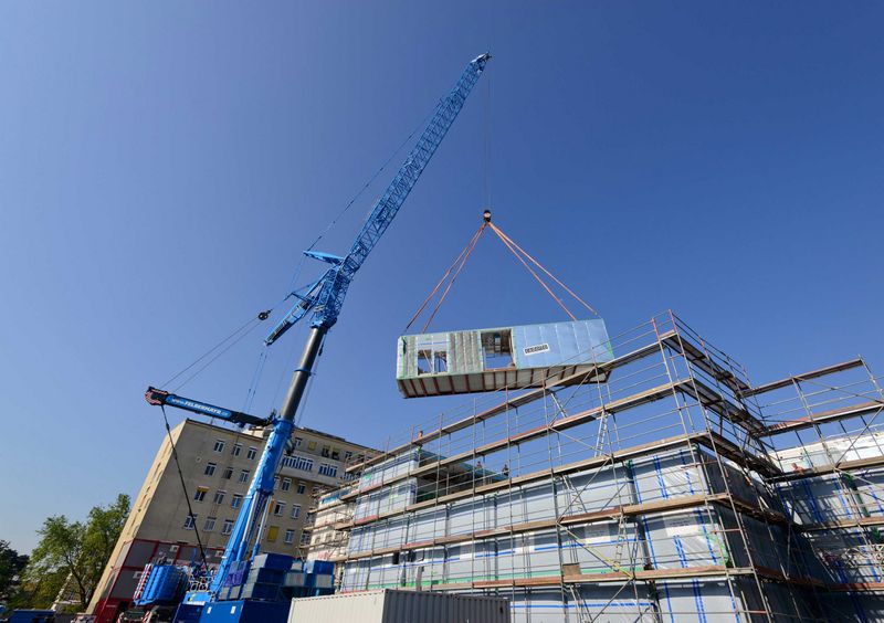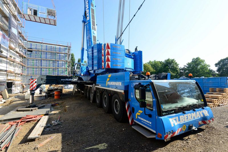 Accesul la locaţia de construcţie s-a transformat într-o operaţiune de mare precizie. În cursul procesului, şasiurile de transport, măsurând până la 36 de metri lungime şi şase metri lăţime au trebuit manevrate cu spatele pe o distanţă de 800 de metri între unităţile spitalului. „Toate acestea au trebuit realizate sub o presiune temporală extraordinară şi ţinând cont de caracteristicile de siguranţă ale spitalului”, a adăugat Füreder. Pentru ridicarea macaralelor în poziţie, s-a utilizat o macara mobilă, cu o capacitate de 800 de tone. Prevăzută cu 204 tone de balast, un braţ telescopic de 56 de metri şi o pârghie oscilantă de 42 de metri, macaraua a avut o rază de acţiune de până la 49 de metri. Datorită pârghiei oscilante montate pe braţul telescopic, s-au putut evita chiar şi muchii aflate la 20 de metri înălţime. De asemenea, s-a utilizat o macara de 300 de tone pentru asistenţă la locaţie. De fapt, unul dintre module a fost ridicat la poziţie de cele două macarale acţionând simultan. Construcţia interioarelor şi instalarea tehnologiei medicale au început încă din toamnă. Noua secţie de chirurgie va deveni funcţională în anul 2016.