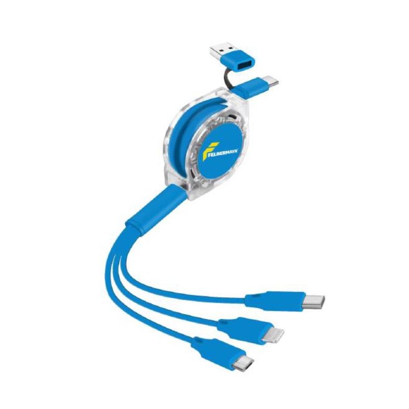 Das aufrollbare 5-in-1 Ladekabel vereint Funktionalität, Flexibilität und kompaktes Design in einem praktischen Gadget. Mit einer Länge von 1 Meter und fünf verschiedenen Anschlüssen ist es ideal für den Alltag – egal ob im Büro, zu Hause oder unterwegs. Der Eingangsanschluss erfolgt über USB oder USB-C und bietet dadurch breite Kompatibilität mit verschiedensten Geräten.