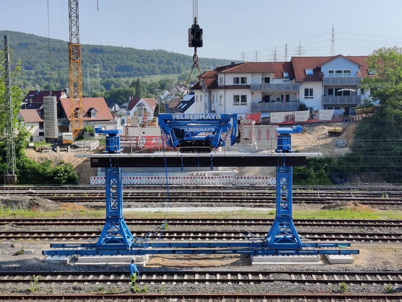 Tím spoločnosti Felbermayr vykonal majstrovské dielo zasunutím nad desať koľají juhovýchodne od železničnej stanice Niedernhausen. Most bol opäť zdvihnutý a jeho ťažšia polovica bola podopretá dvomi SPMT, každým so šiestimi nápravami. Dva desaťnápravové SPMT vzadu zaťažené oceľovými platňami slúžili ako prídavné pohonné, respektíve brzdiace vozidlá – pre maximálnu bezpečnosť pri zasúvaní k nižšie umiestnenému predmostiu. Konfigurácia, ktorá teraz vážila celkom 630 ton, bola tlačená pomocou hydraulického lisu s klznými ložiskami – 37 metrov až po posuvný nosník, s 500-tonovým postupovým lisom v strede koľajového systému. „Kvôli prudkému sklonu sme museli tento špeciálny nosný systém zostrojiť o tri týždne skôr s dodatočným premiestnením“, vysvetľuje Kompier. Na milimeter presný príchod mosta, ktorý sa zdanlivo vznášal na obidvoch klzných ložiskách centrálnej podpery, bol skutočne divadelným predstavením špeciálnej úrovne.
